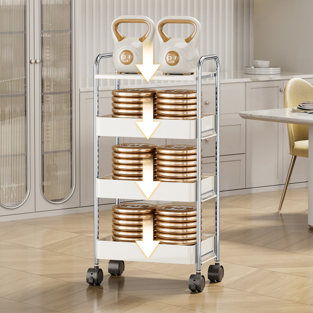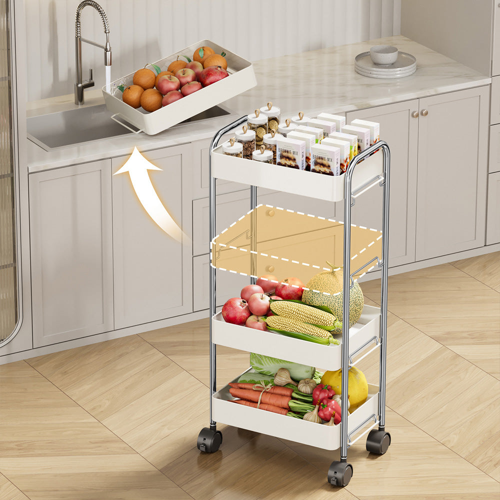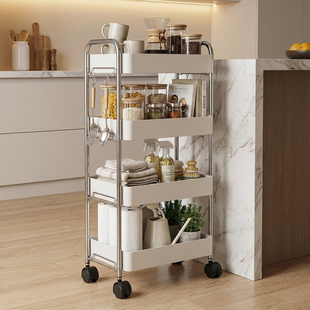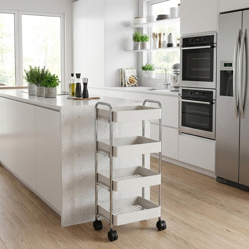 نظّم مساحتك بسهولة تامة مع سلة التخزين المتحركة متعددة الاستخدامات ذات الأربعة أرفف، المصممة للمطابخ والحمامات وغرف النوم والمكاتب وغيرها. تتميز هذه السلة بهيكل متين من الفولاذ الكربوني وسلال عالية الجودة، ما يجمع بين المتانة وسهولة الحركة والتصميم العصري.