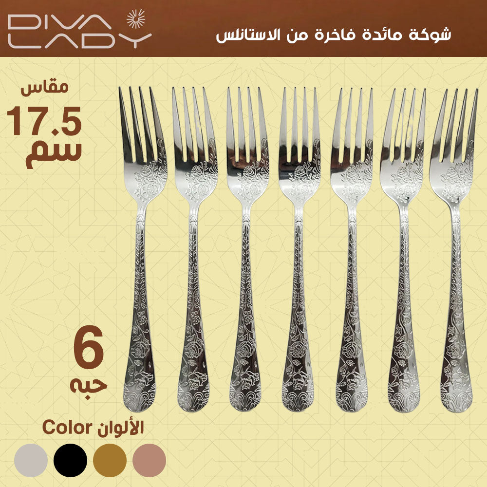مجموعة شوك مائدة مقاس 17.5 سم فاخرة مصنوعة من ستانلس ستيل عالي الجودة مع نقوش أنيقة تضيف لمسة جمالية إلى سفرتك من ديفا ليدي .