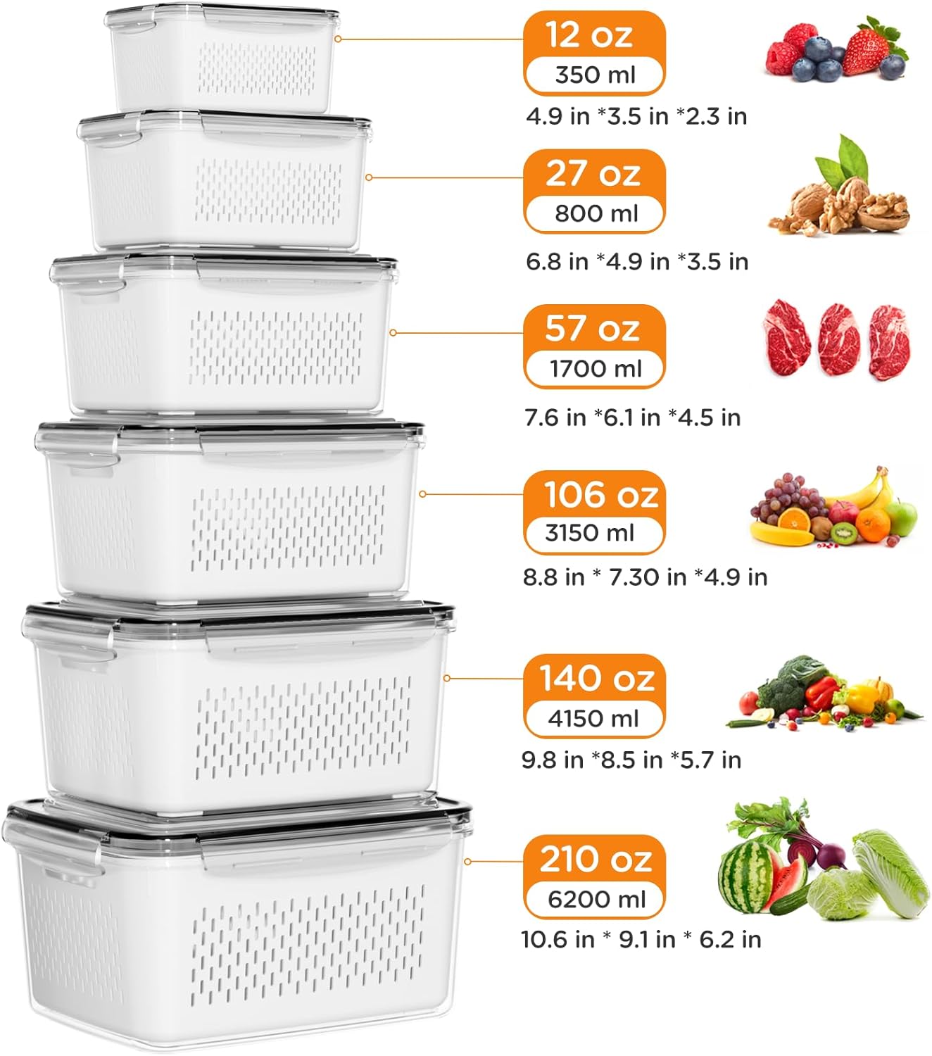 - 【6 أحجام مختلفة لجميع احتياجاتك】 تتضمن حاويات الفاكهة الترقية لمجموعة الثلاجة 6 عبوات بحجم جامبو 210 أونصة (6.2 لتر) + X- حجم كبير 140 أونصة (4.15 لتر) + حجم كبير 106 أونصة (3.15 لتر) + حجم متوسط 57 أونصة (1.7 لتر) + حجم صغير 27 أونصة (0.8 لتر) + حجم صغير 12 أونصة (0.35 لتر). يمكن أن تناسب القدرات المختلفة بشكل مثالي معظم منتجات الفواكه والخضروات وغيرها من أماكن تخزين المواد الغذائية.