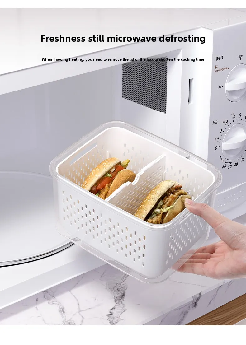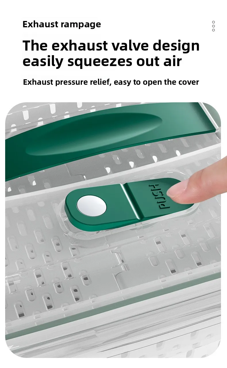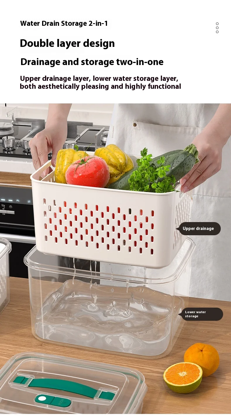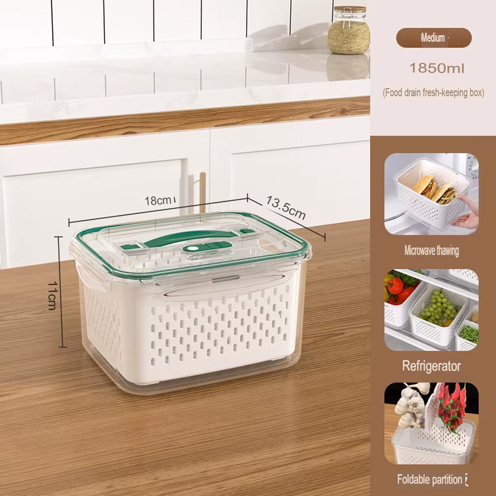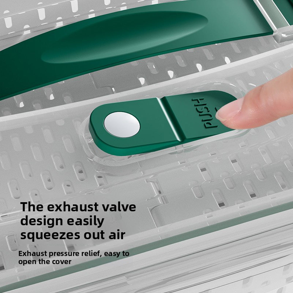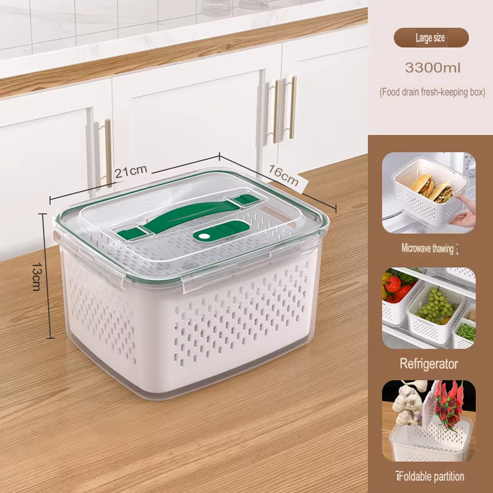 حافظ على نضارة طعامك لفترة أطول مع صندوق التخزين المحكم هذا، بتصميمه المزدوج الطبقات مع سلة تصريف قابلة للرفع. يحتوي الغطاء المحكم على زر صمام هواء لسهولة تحرير الضغط، مما يجعله مثاليًا لتخزين الفواكه والخضراوات واللحوم وبقايا الطعام. آمن للاستخدام في الميكروويف لإذابة الثلج، والتخزين في الفريزر، ومثالي لتنظيم الثلاجة يوميًا.