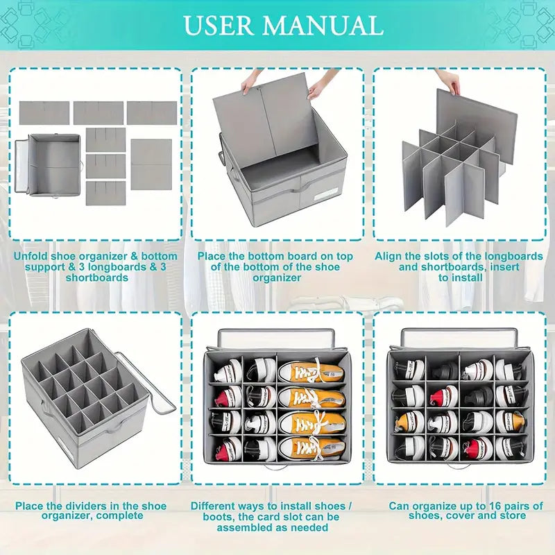 منظم أحذية بـ 16 زوجًا، شفاف قابل للطي من قماش تخزين الأحذية بقاعدة داعمة، صناديق أحذية مستطيلة كبيرة، مقاومة للماء، إغلاق بواسطة الضغط، حامل أحذية موفر للمساحة بمقابض معززة، رمادي، أثاث خزانة متعدد الاستخدامات
