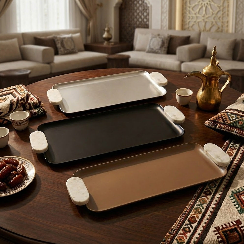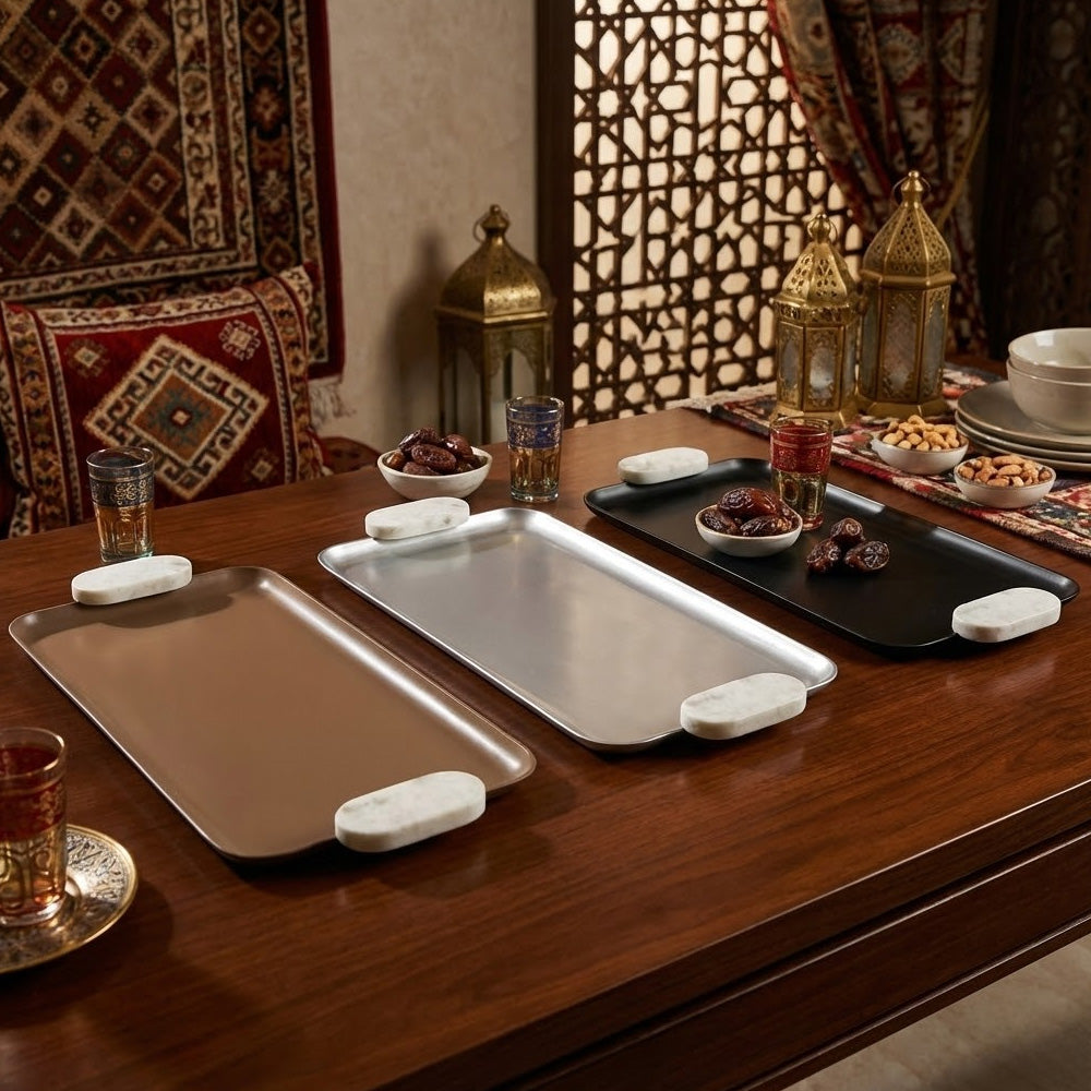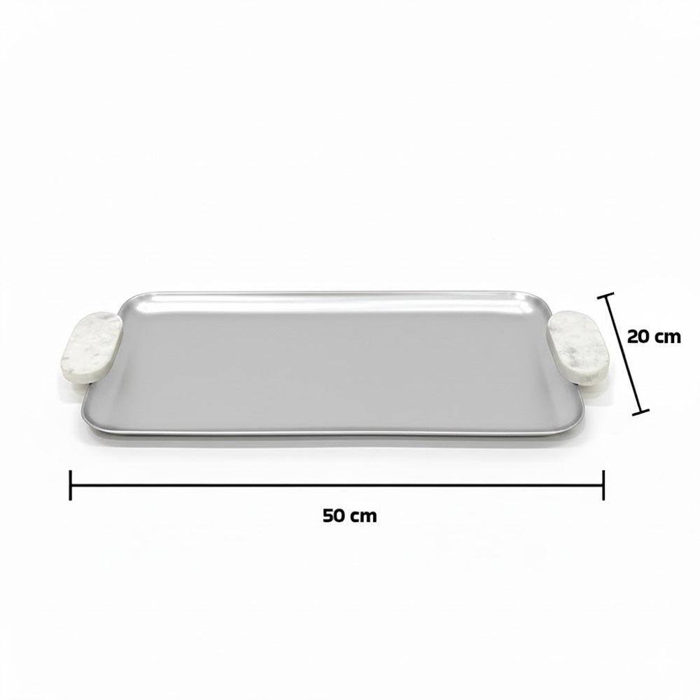 بحجمها الكبير (50 × 20 سم)، تُعد مثالية لتقديم المشروبات والمقبلات والحلويات، أو كصينية زينة على طاولات القهوة أو أسطح المطبخ أو طاولات الزينة. تساعد الحواف المرتفعة على تثبيت المحتويات، بينما توفر مقابض الرخام المتينة قبضة مريحة ولمسة نهائية فاخرة.