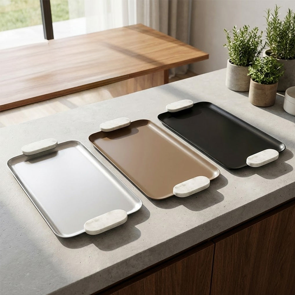 ارتقِ بتجربة تقديم الطعام مع صينية التقديم المستطيلة العصرية هذه، المصممة لتجمع بين العملية والأناقة الراقية. تتميز بسطح معدني أملس ومقابض أنيقة من حجر الرخام على كلا الجانبين، مما يضفي لمسة عصرية على أي غرفة طعام أو معيشة.
