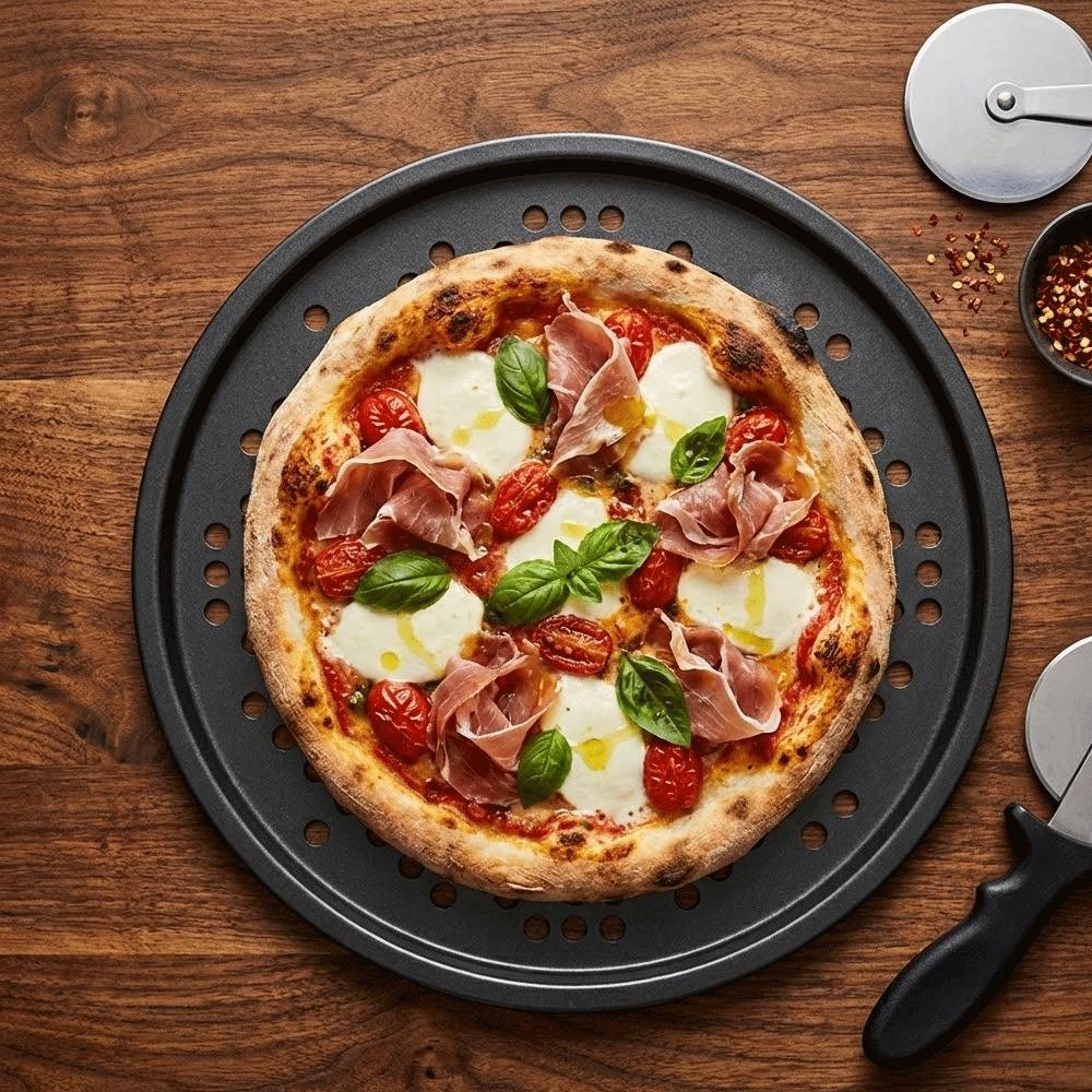 بفضل التصميم المثقّب، تسمح الصينية بتدفق الهواء الساخن أسفل العجين، مما يساعد على التخلص من الرطوبة الزائدة والحصول على قاعدة ذهبية مقرمشة، تمامًا مثل أفران المطاعم.