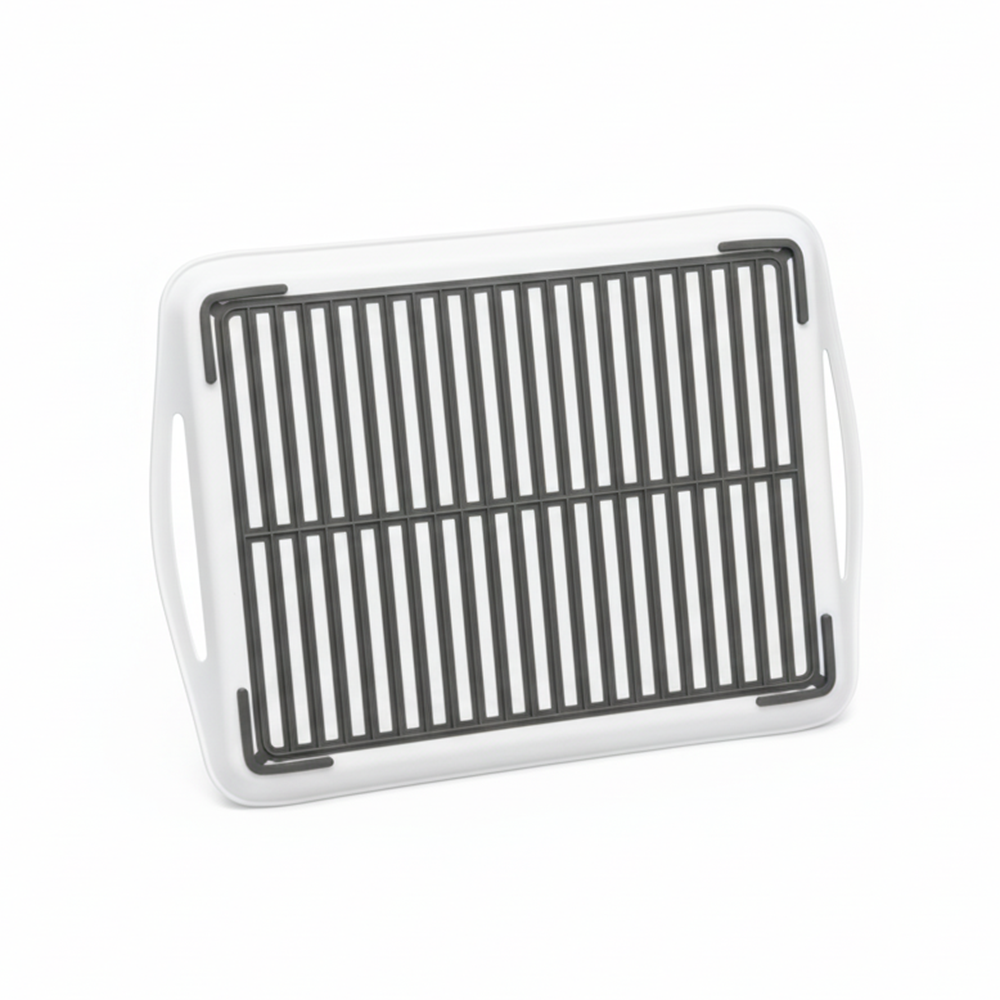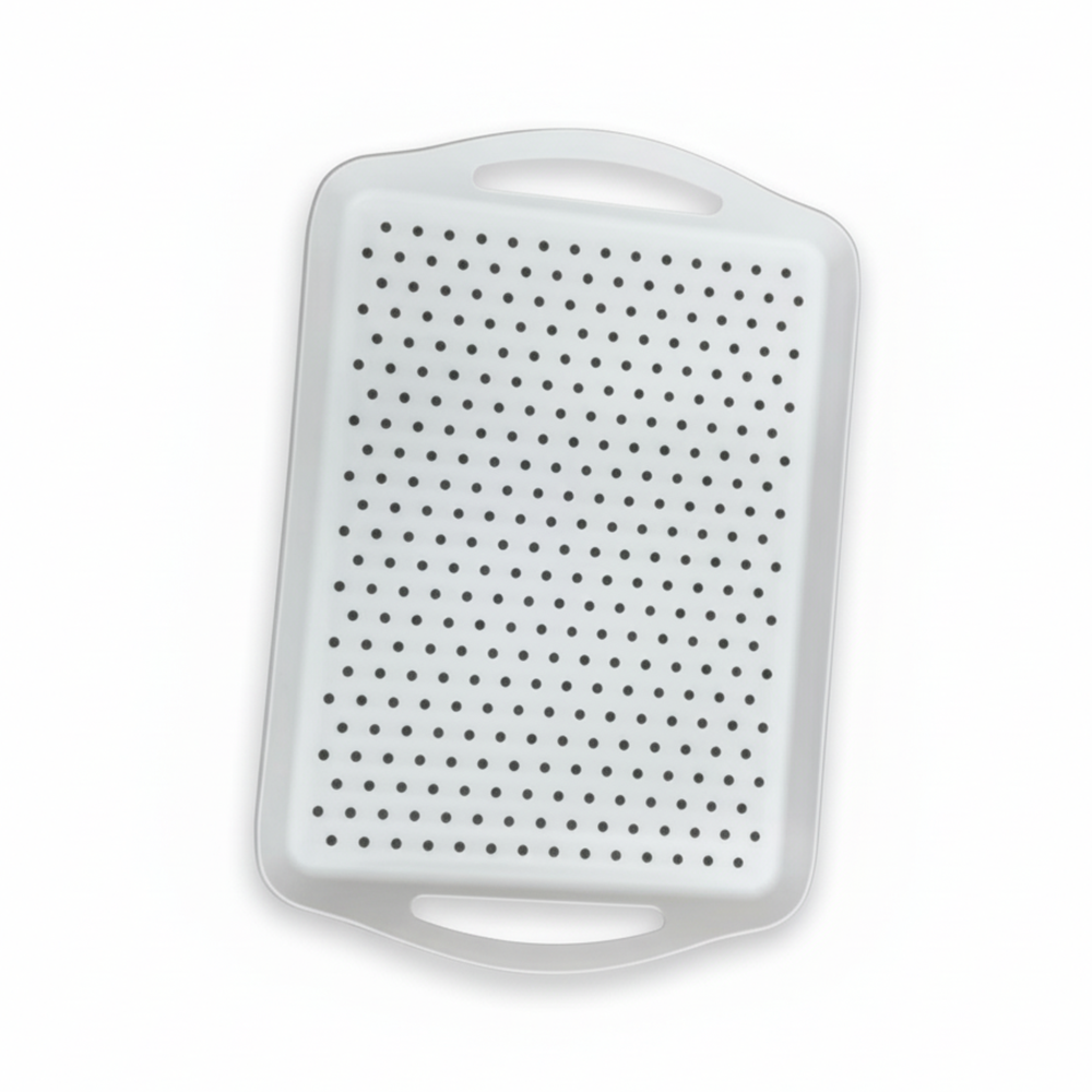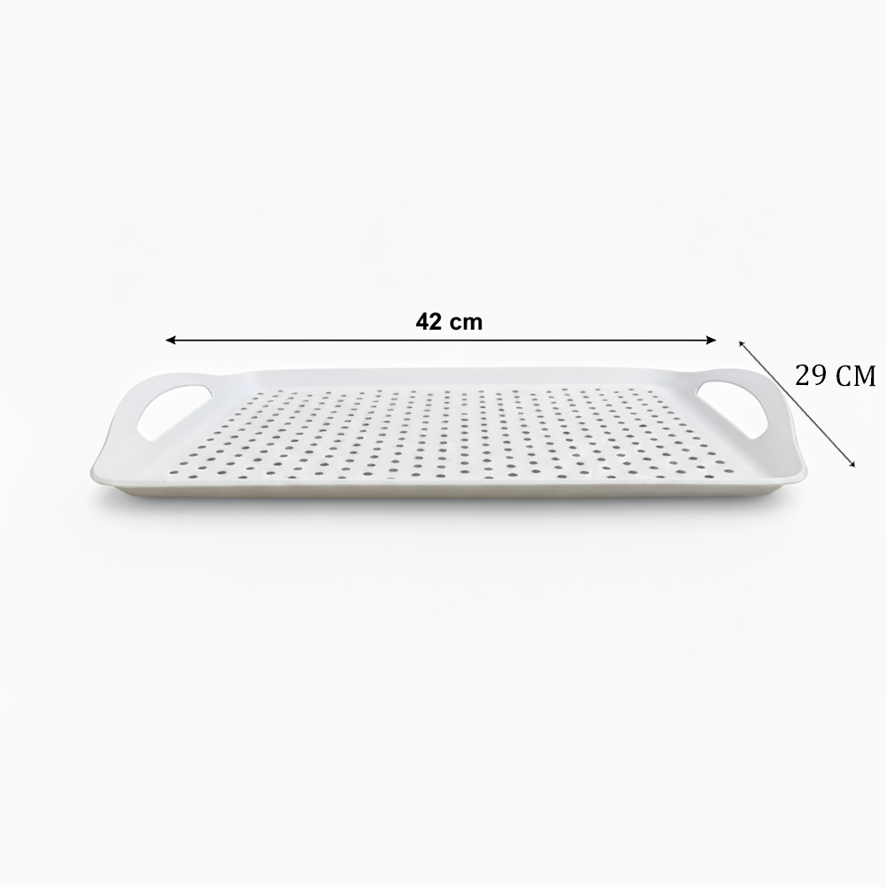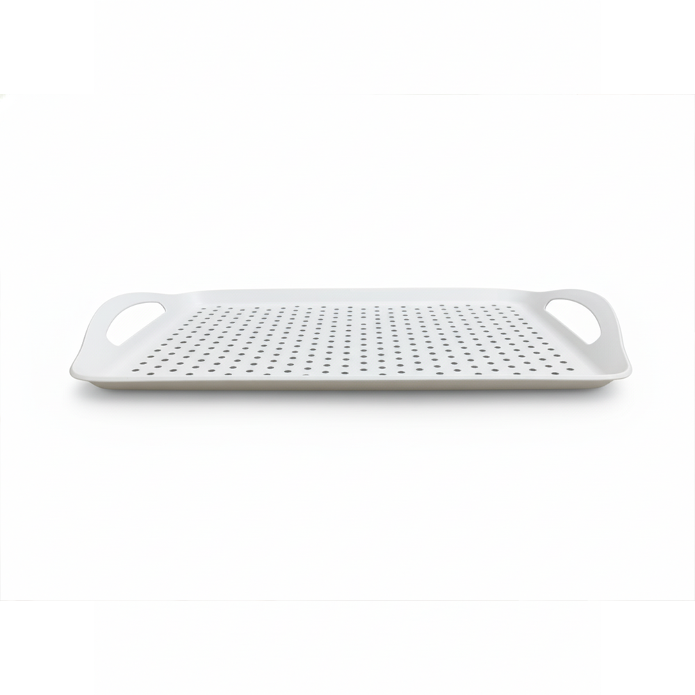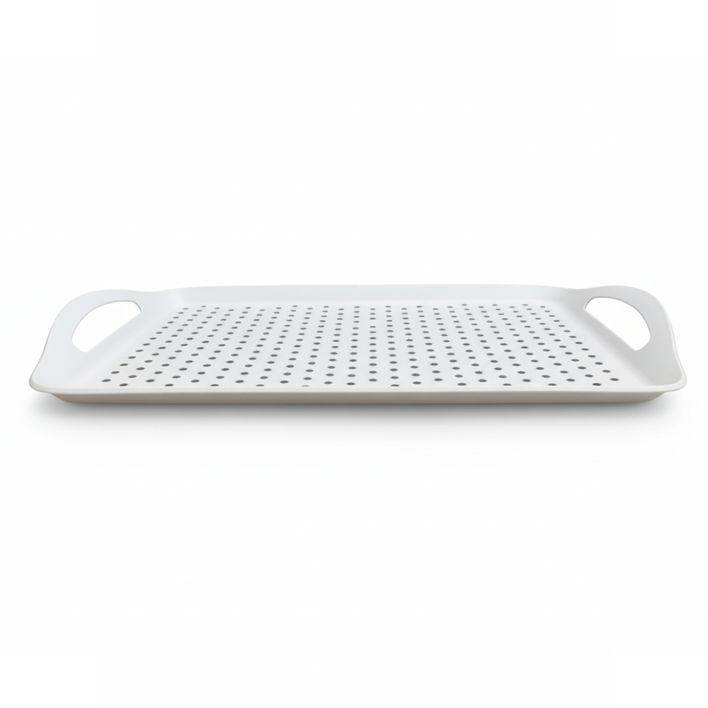 أضيفي لمسة من الأناقة والعملية إلى منزلك مع صينية التقديم البلاستيكية متعددة الاستخدام ذات التصميم العصري والمثقب لتصريف السوائل بسهولة.