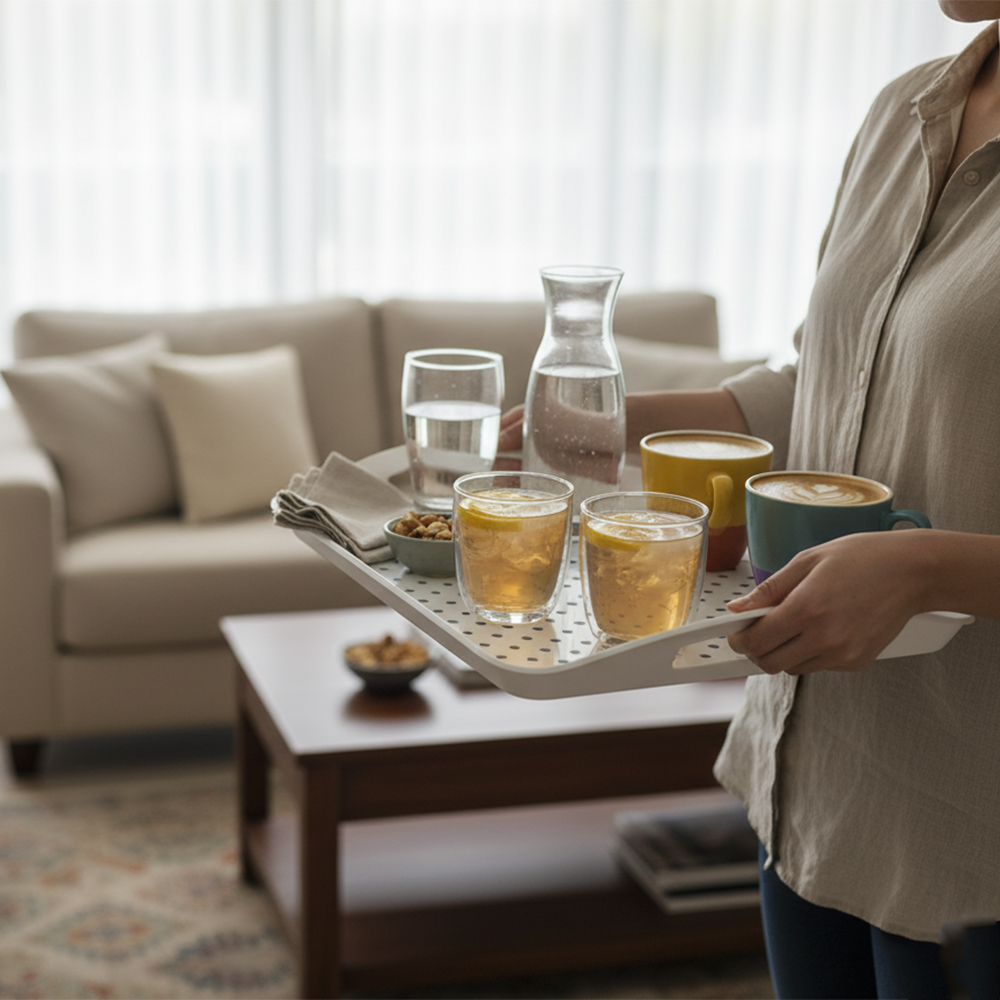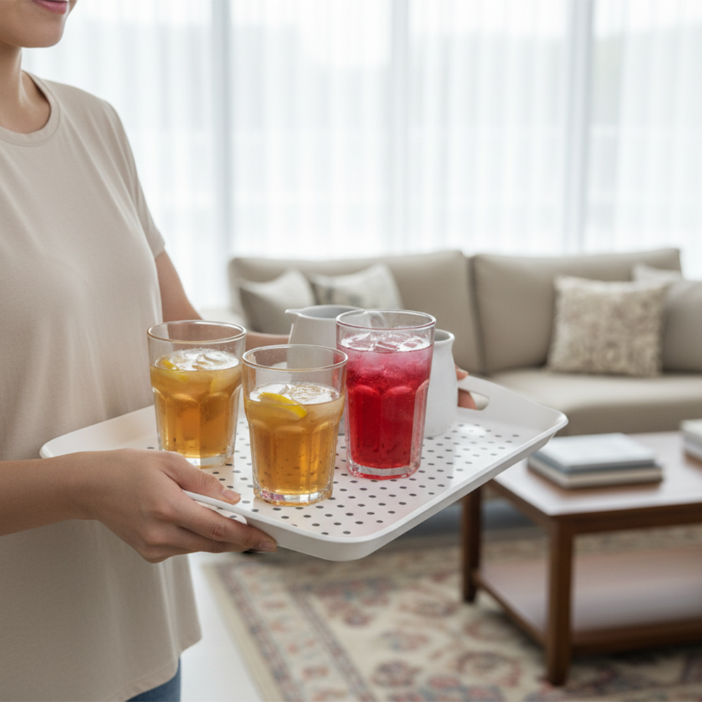 تأتي بمقابض جانبية مريحة لسهولة الحمل والتحكم، كما أنها خفيفة الوزن ومقاومة للماء، ما يجعلها مثالية لتقديم القهوة والشاي أو لاستخدامها كصينية تنظيم للمطبخ والحمام.
