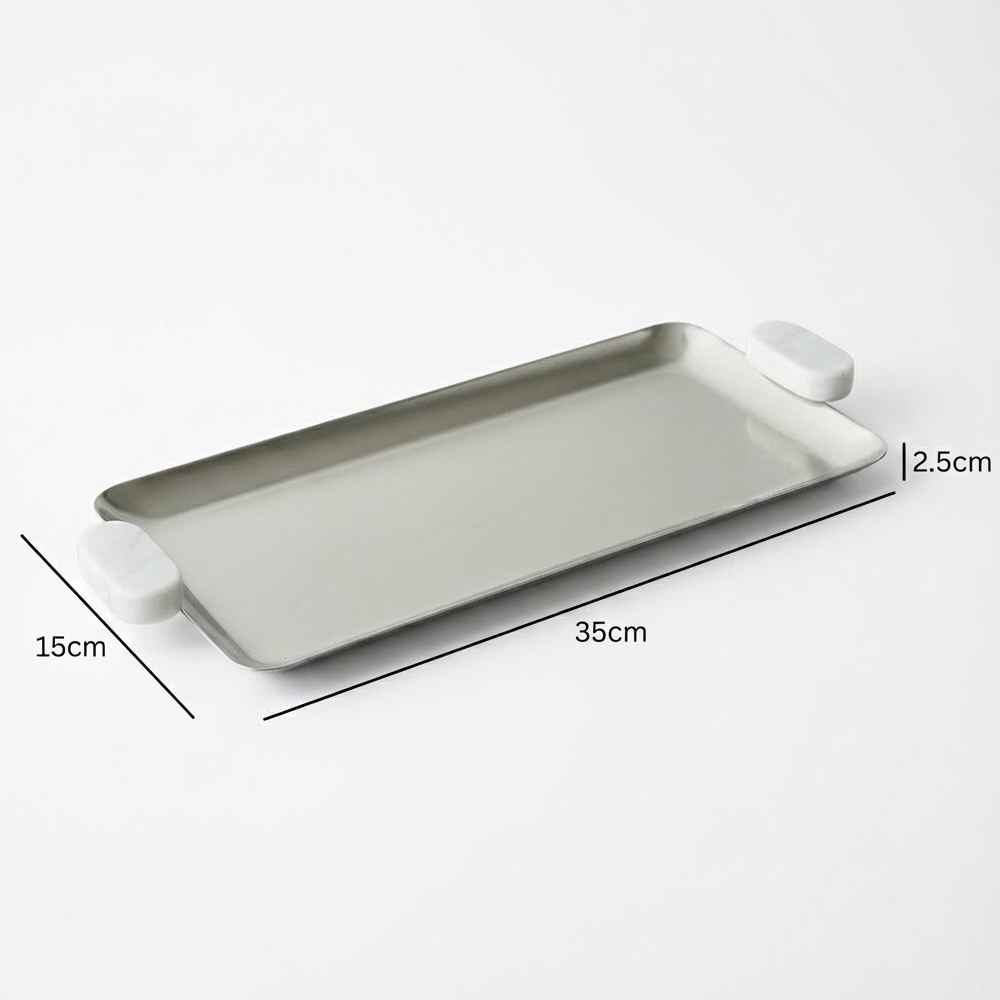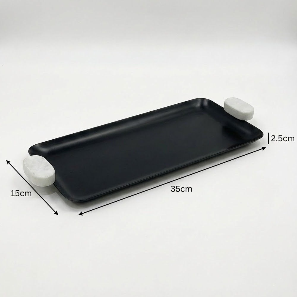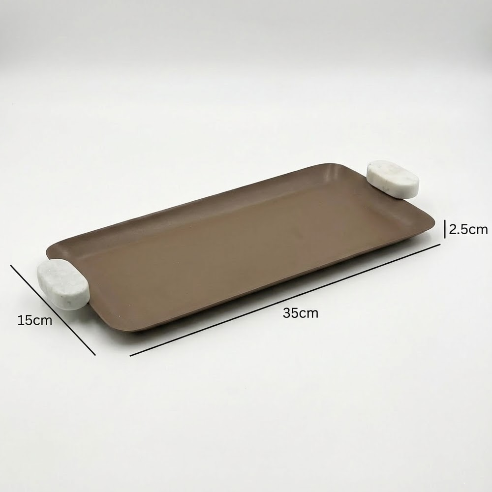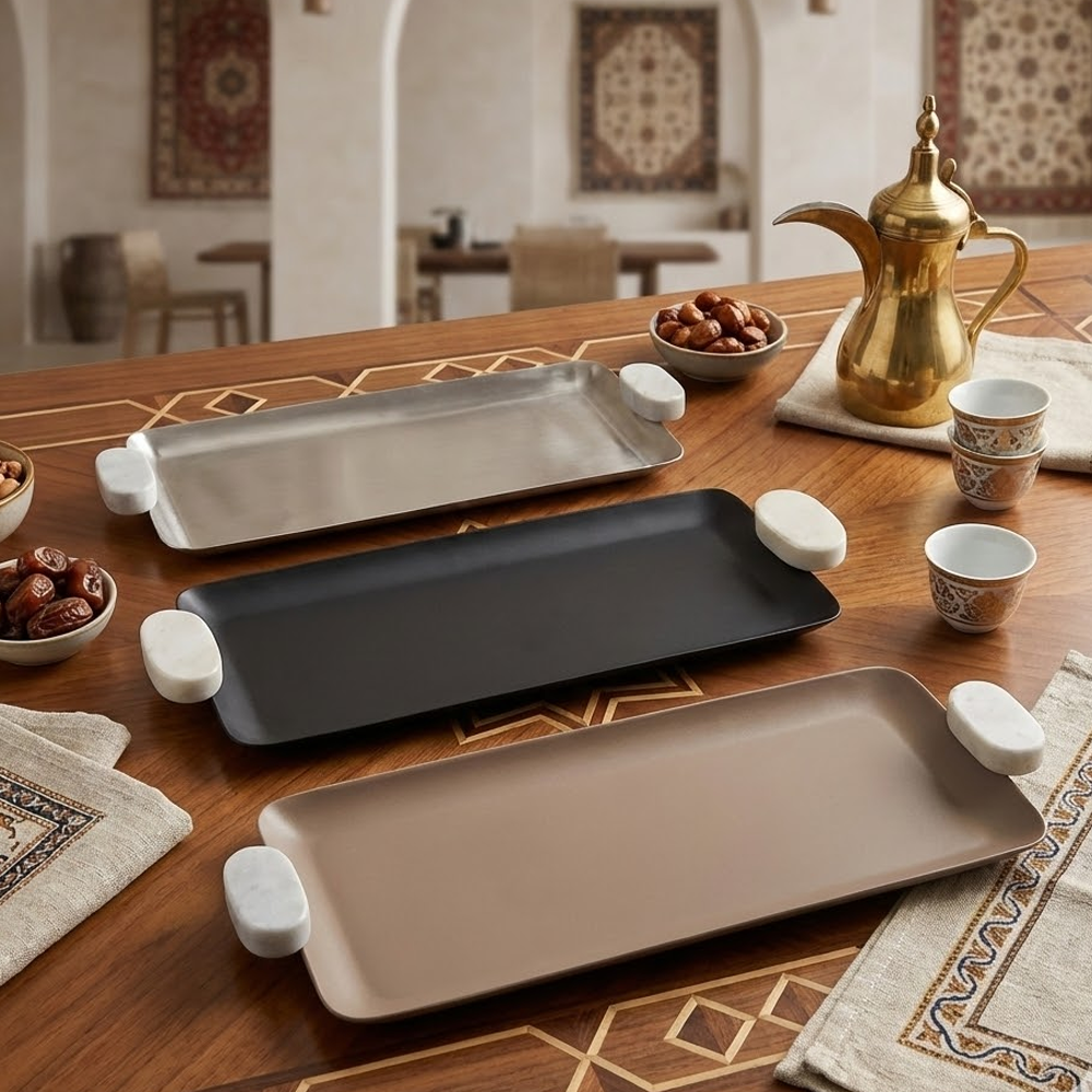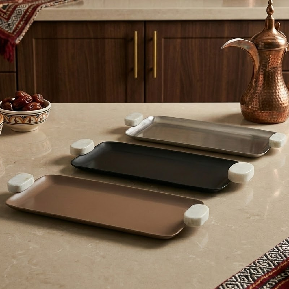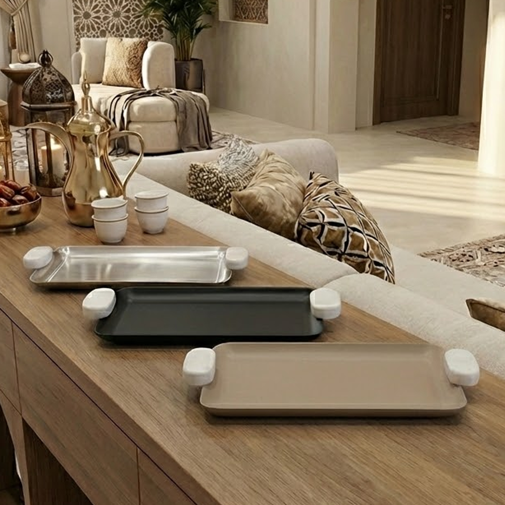تتميز بتصميم مستطيل أنيق مع مقابض جانبية بلمسة رخامية، مما يجعلها مثالية لتقديم القهوة، التمر، الحلويات، أو المقبلات في مختلف المناسبات، من الضيافات اليومية إلى التجمعات الخاصة.