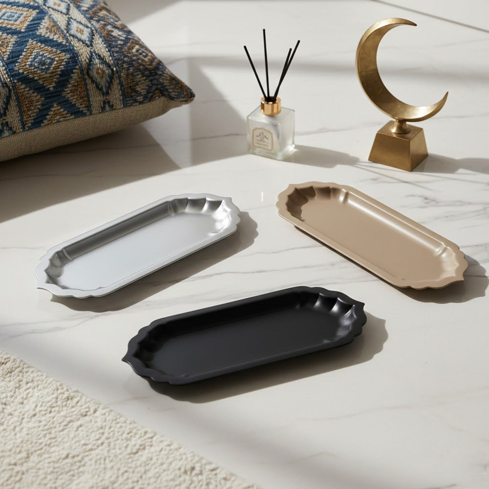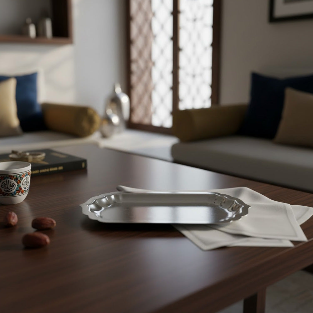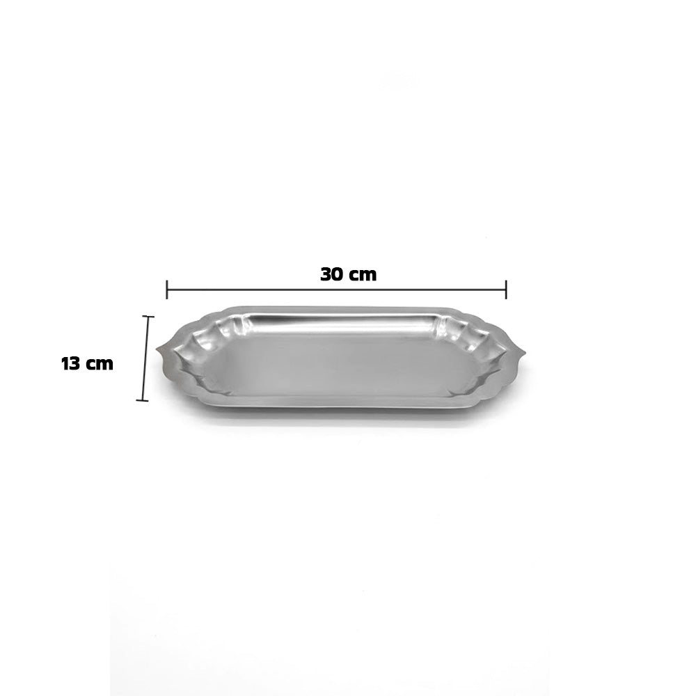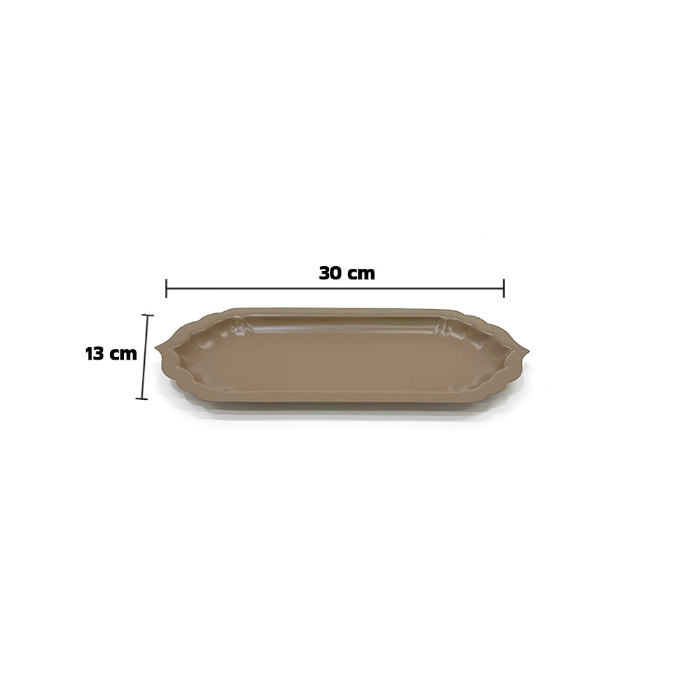 صينية تقديم مستطيلة أنيقة بتصميم راقٍ وحواف مزخرفة، مثالية لتقديم الحلويات والتمر والمقبلات والمشروبات الساخنة والباردة. شكلها الانسيابي وحجمها المتناسق يجعلانها مناسبة للاستخدام اليومي والمناسبات الخاصة.