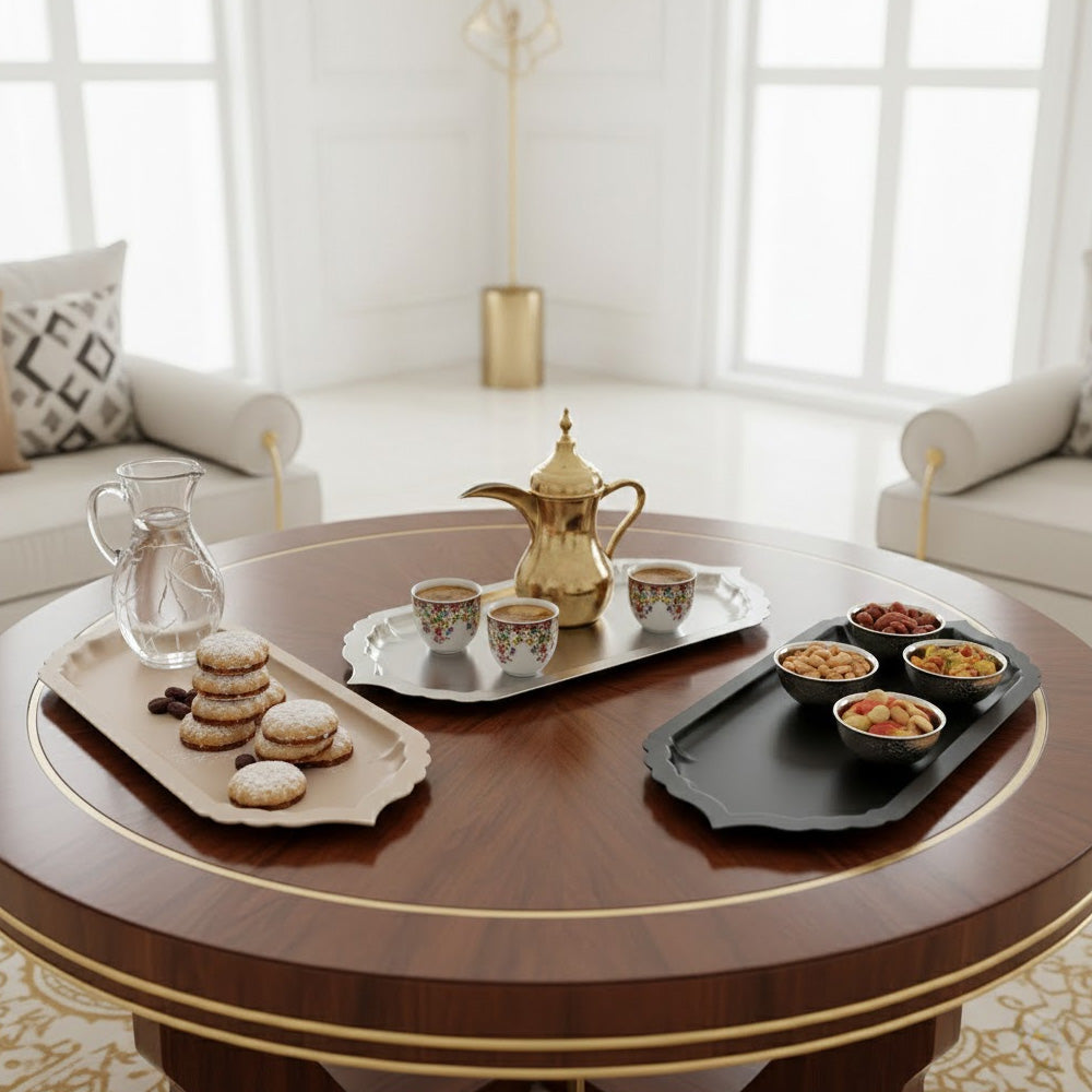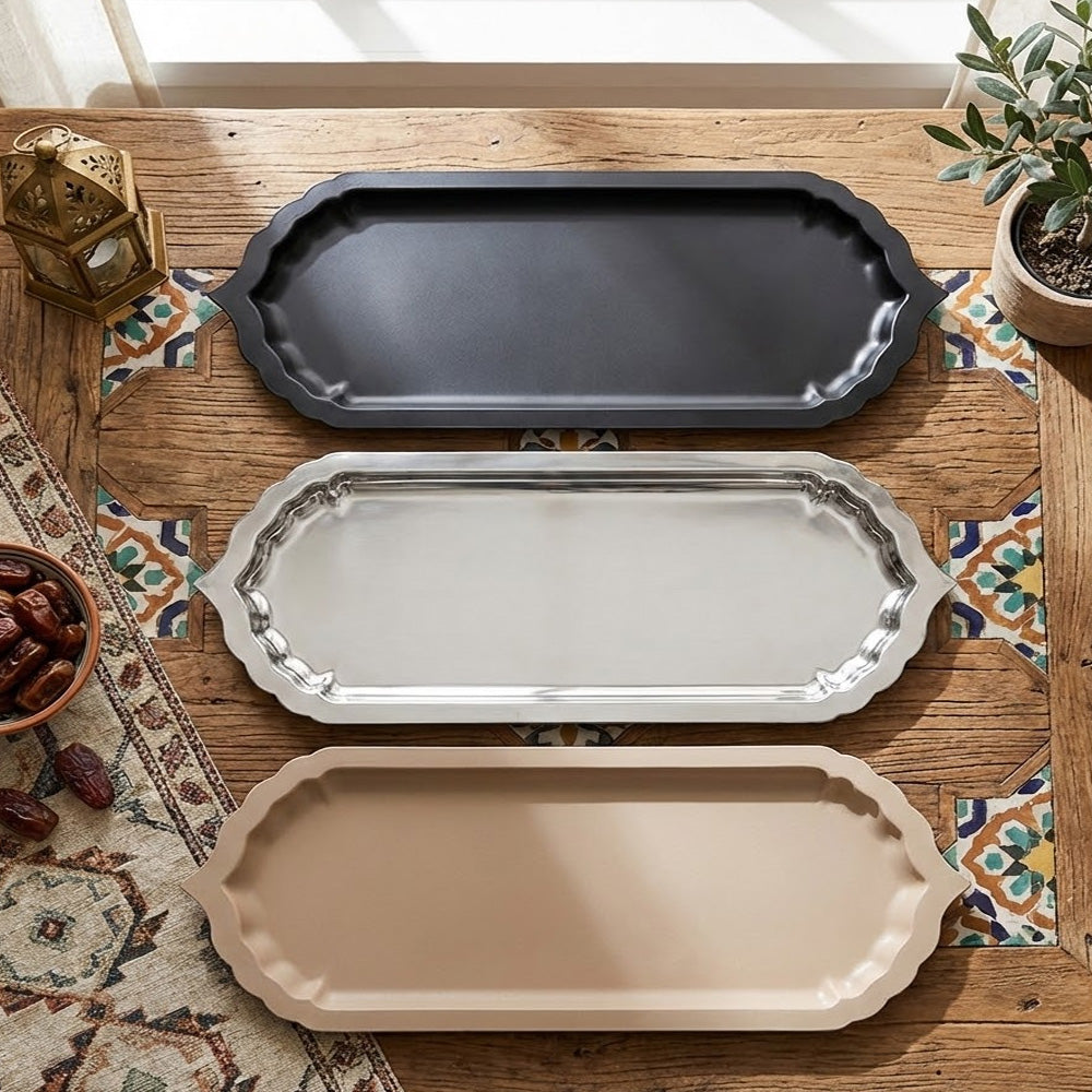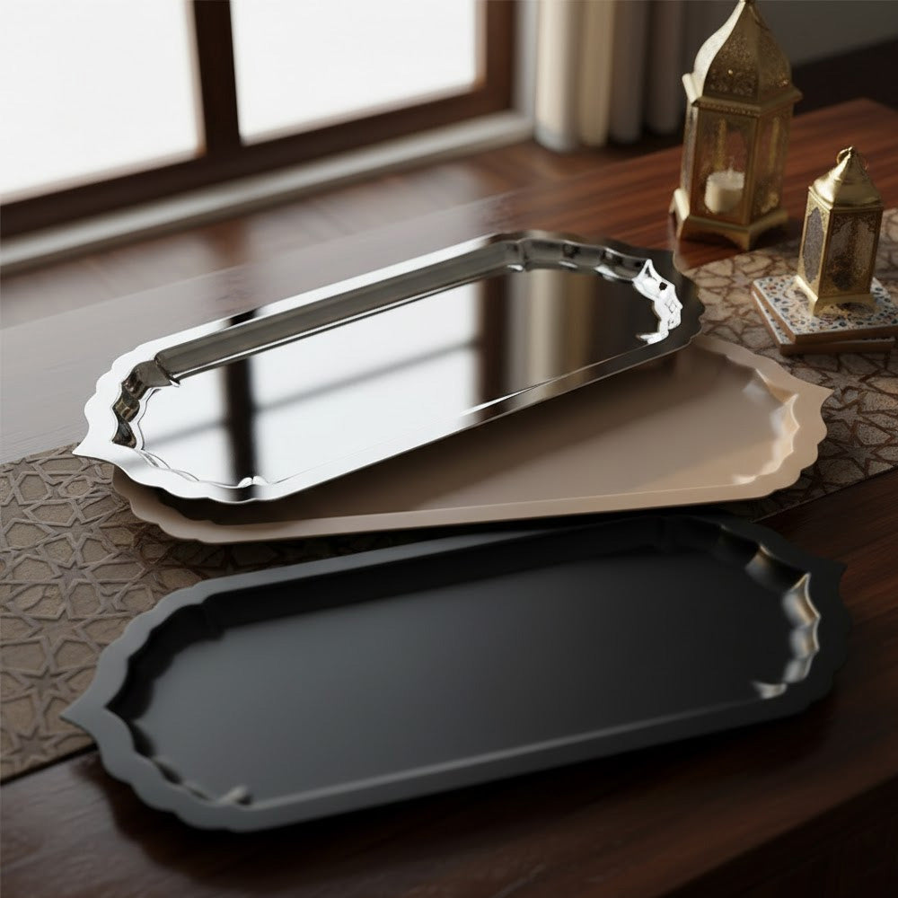 صينية تقديم مستطيلة كبيرة بتصميم أنيق ومتناسق، تُضفي لمسةً راقيةً على أي تجربة طعام أو عرض. شكلها الطويل وحوافها المنحوتة بدقة تُعطيها مظهرًا أنيقًا، مثالية لتقديم الحلويات والمعجنات والمقبلات والمشروبات بأناقةٍ لا مثيل لها. حجمها الكبير يجعلها مثاليةً للتجمعات والمناسبات الخاصة، أو حتى لتقديمها بشكلٍ فاخرٍ في المناسبات اليومية. بفضل ألوانها المحايدة الخالدة، تُناسب هذه الصينية أنماط المائدة العصرية والكلاسيكية على حدٍ سواء.