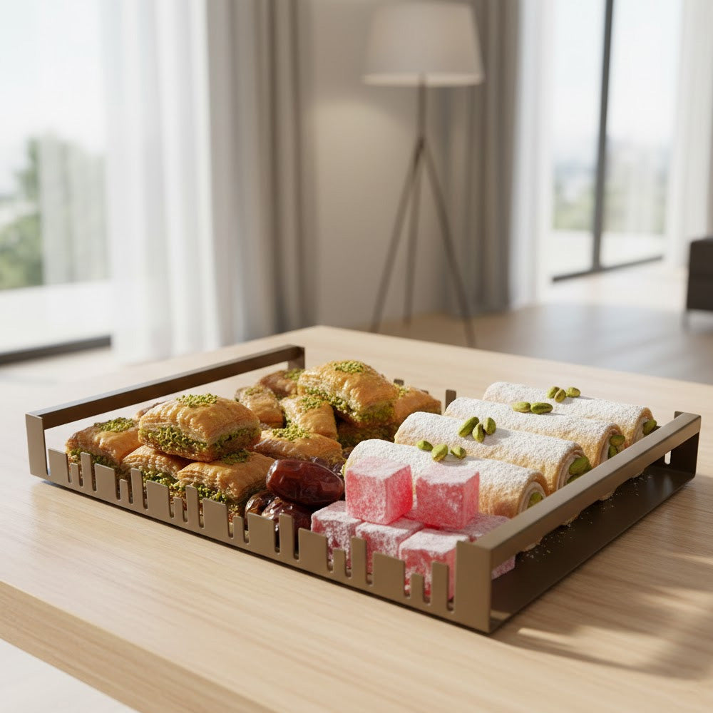 تعدد الاستخدامات: مثالية لتقديم القهوة والشاي، أو كقاعدة أنيقة للعطور، الشموع، والمباخر، وحتى لتقديم التمور والحلويات بشكل عصري.