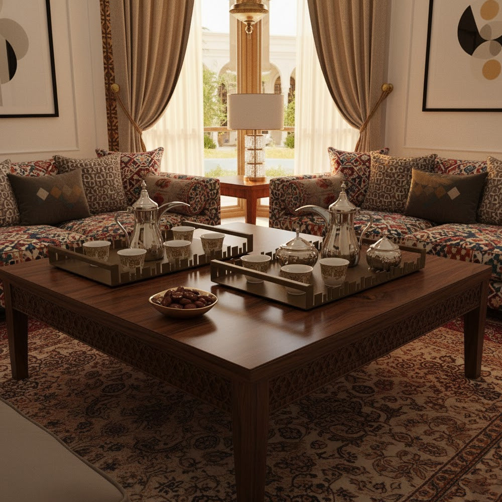 تتناغم هذه الصواني بشكل مذهل في المجالس العربية الحديثة. يمكنك وضعها على طاولة القهوة الرخامية أو الخشبية، وتنسيقها مع فناجين قهوة مودرن أو مزهرية صغيرة لإبراز جمال تفاصيلها الهندسية.