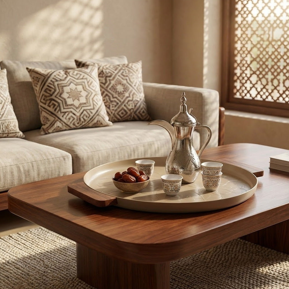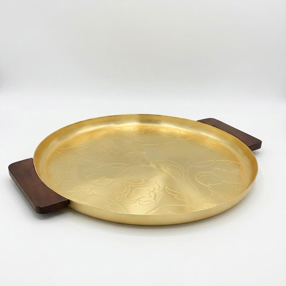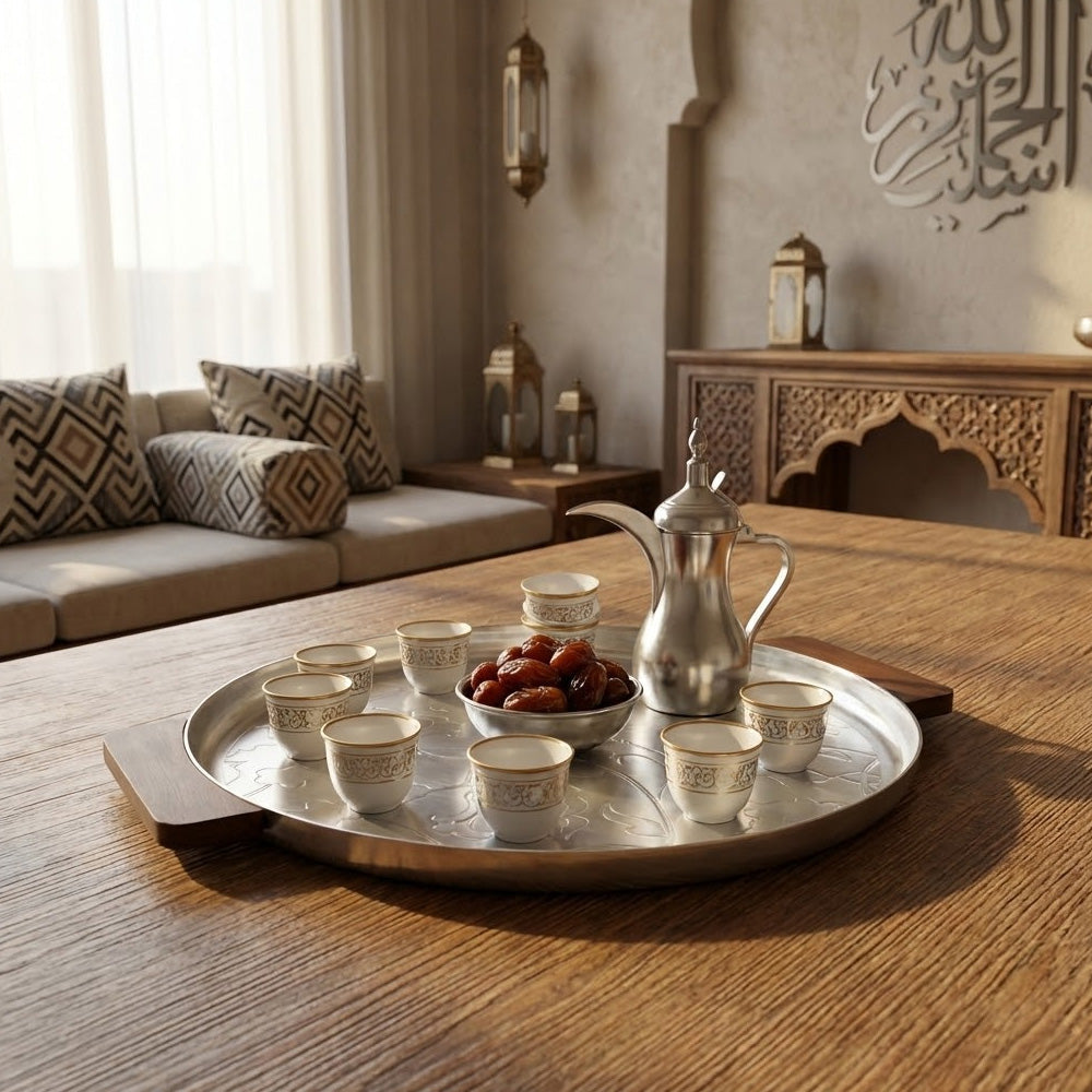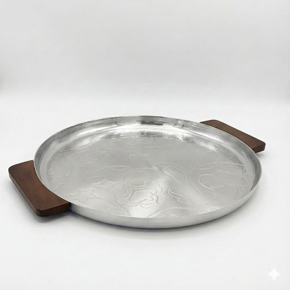 ارتقِ بتجربة تقديمك مع صينية التقديم المعدنية الدائرية الفاخرة هذه (٥٠ سم)، المصممة لتجمع بين الأناقة والعملية. مصنوعة من معدن عالي الجودة ومزينة بنقوش دقيقة، تتميز هذه الصينية بمقابض جانبية من الخشب الطبيعي توفر قبضة مريحة وتضفي لمسة دافئة على سطحها المعدني الأملس.