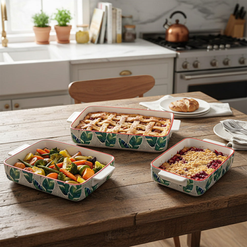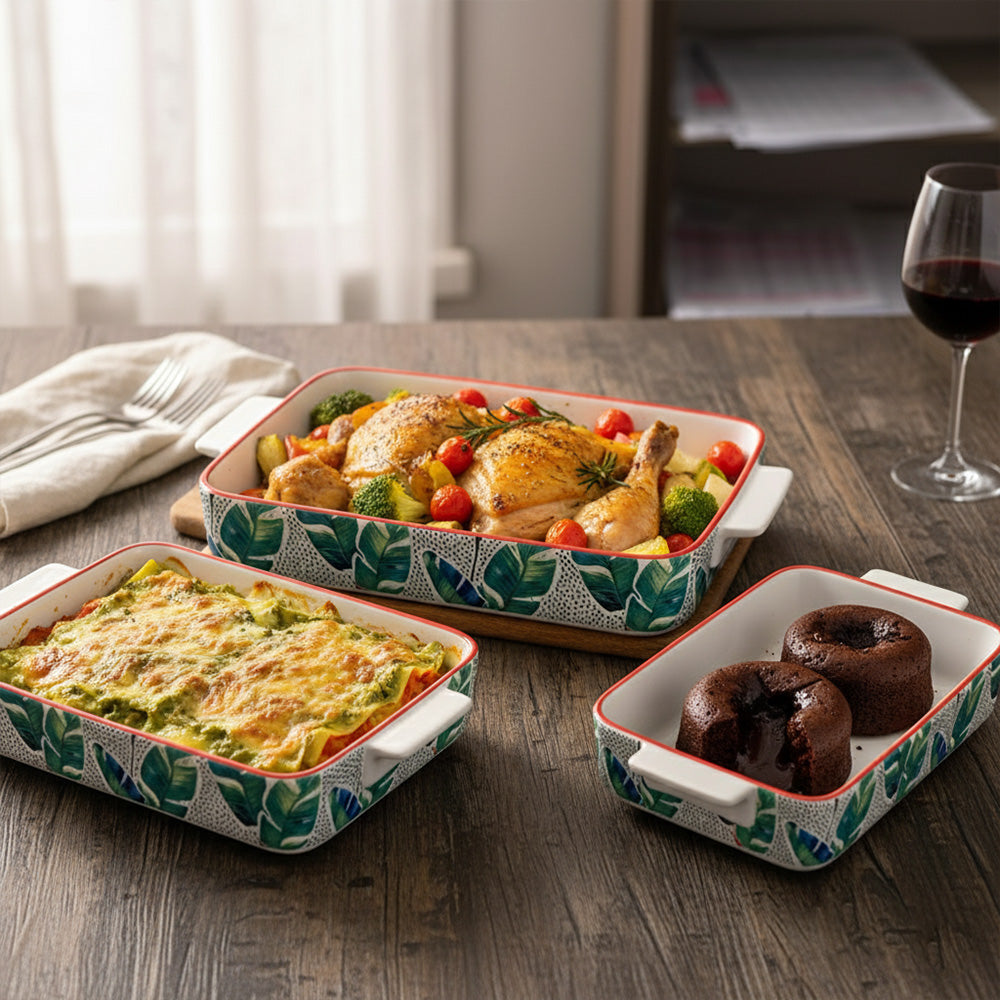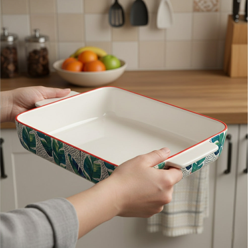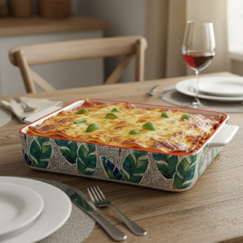 هذا الطبق آمن للاستخدام في الفرن والميكروويف وغسالة الأطباق، ويجمع بين الراحة والتصميم الأنيق.