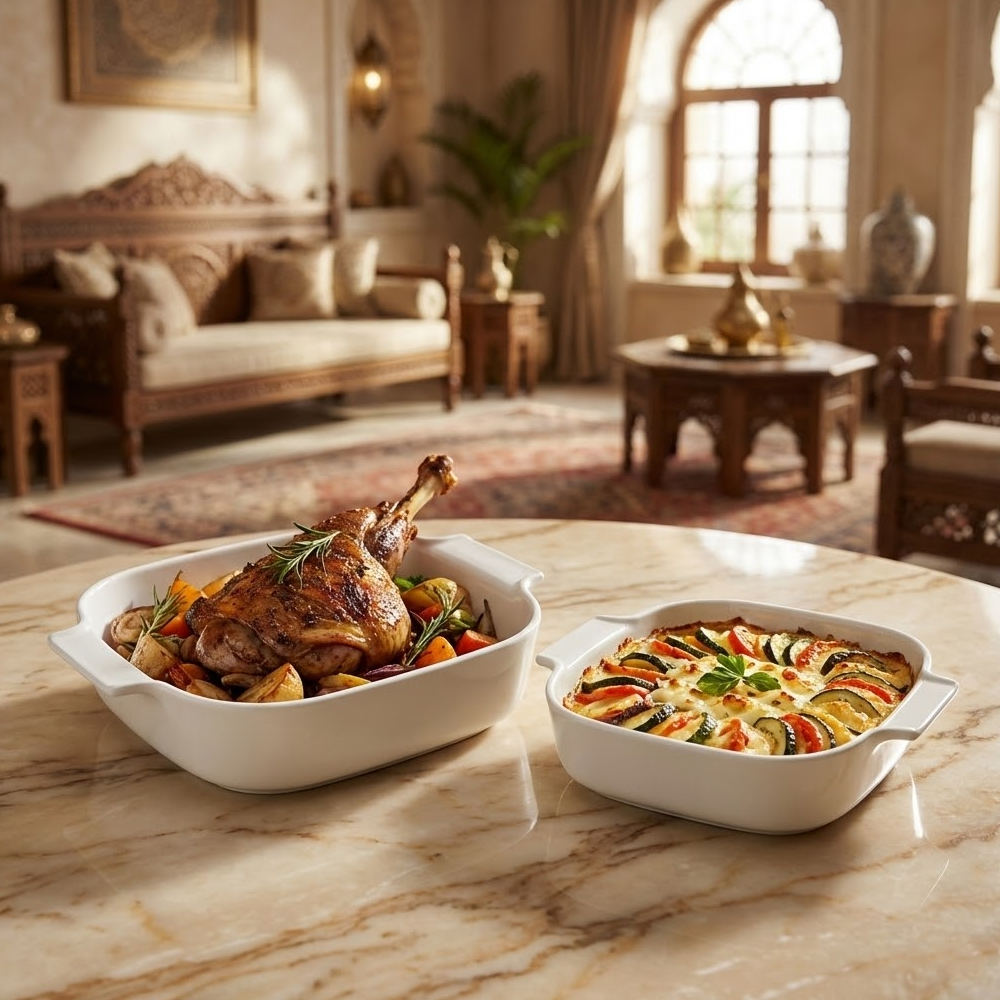 استمتع بتجربة طهي وتقديم راقية مع صينية الفرن السيراميك البيضاء المصممة لتجمع بين الأداء العملي والشكل الأنيق.