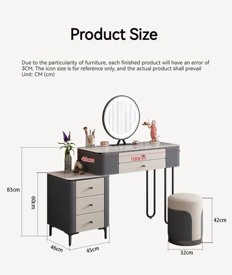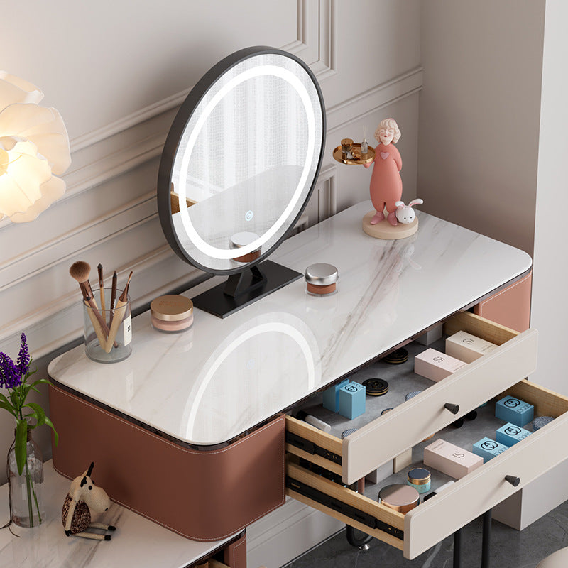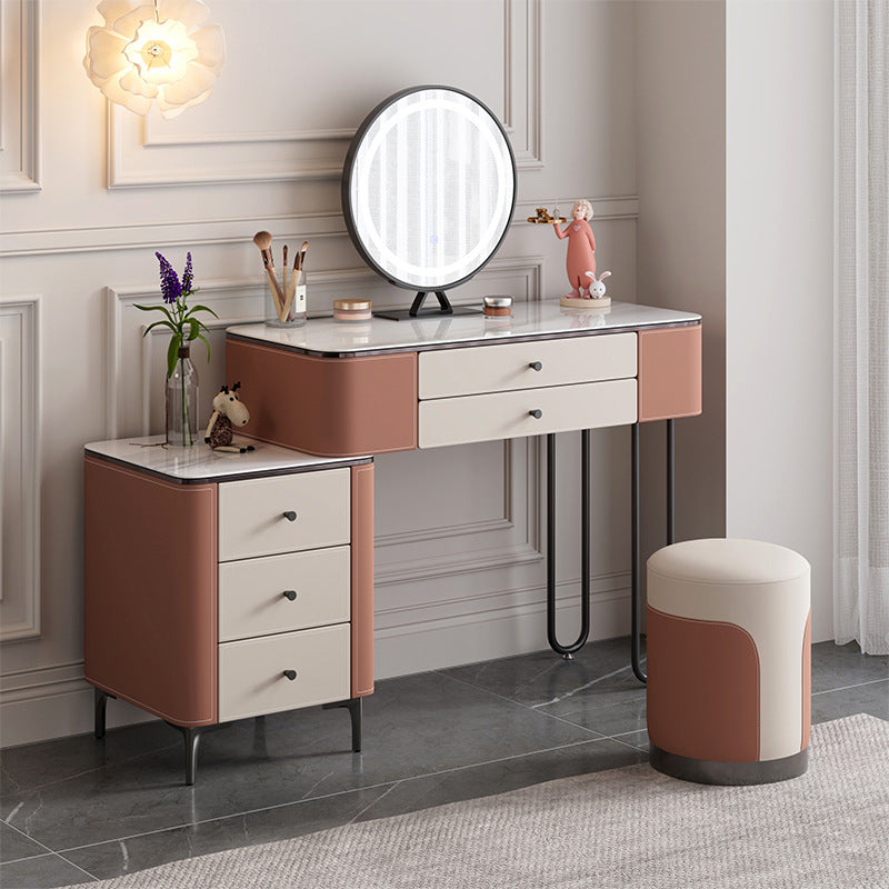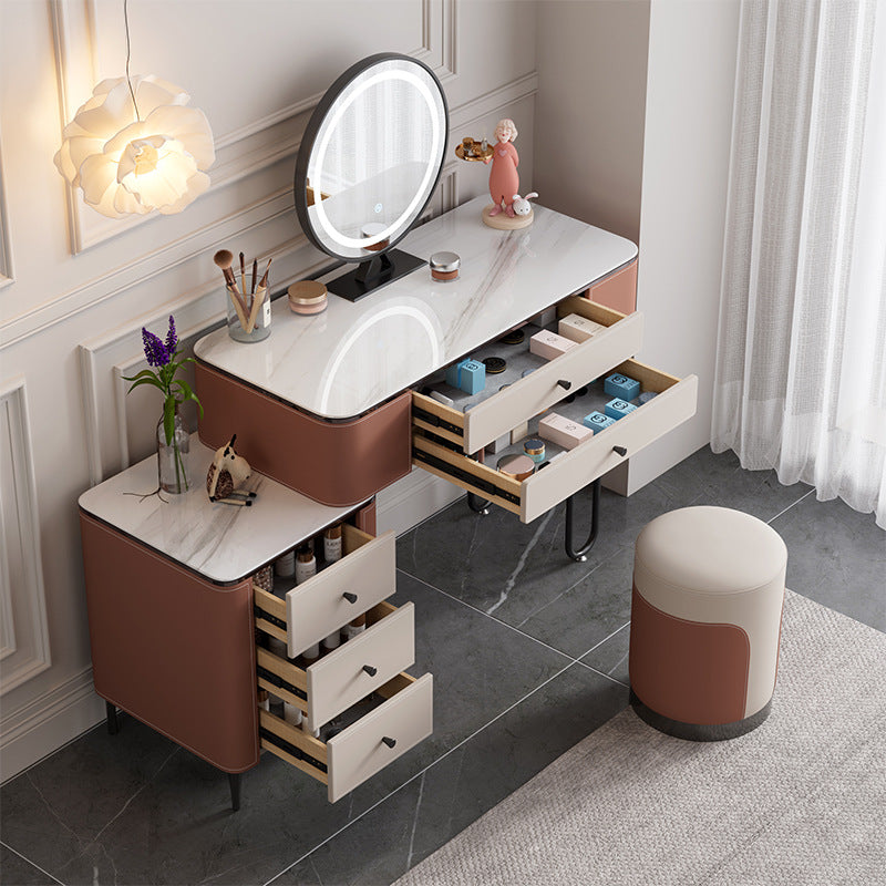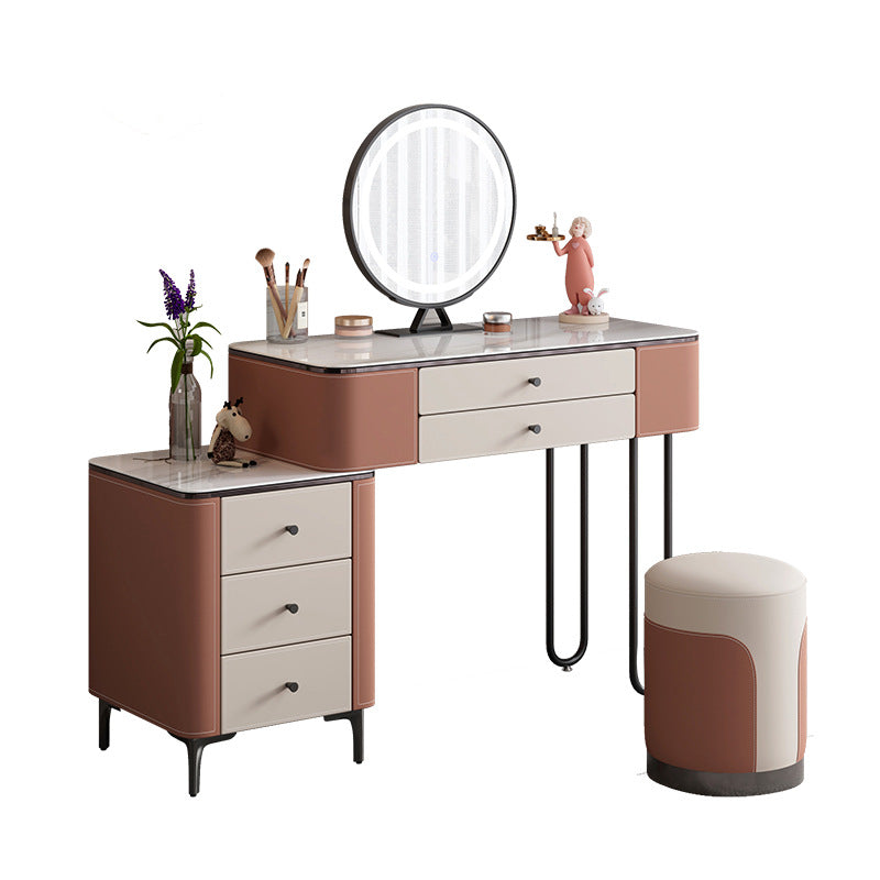 طاولة زينة جلدية جديدة لغرفة النوم 5 أدراج مزودة بإضاءة فاخرة وحديثة وبسيطة لتخزين المكياج وخزانة مرآة مدمجة متقدمة / اللون البرتقالي كما موضح بالصور