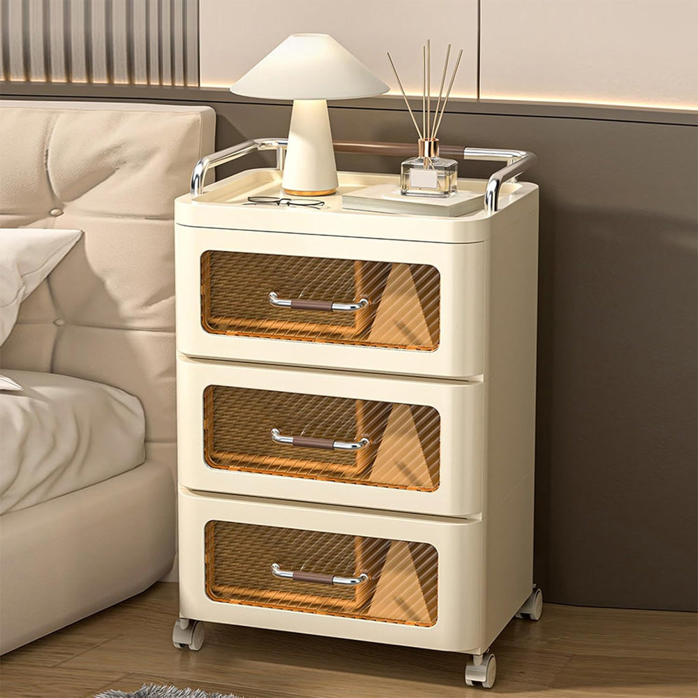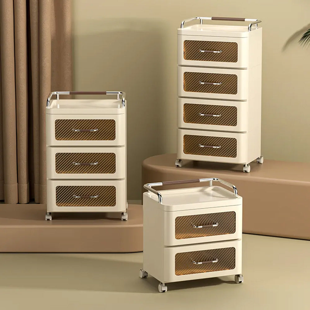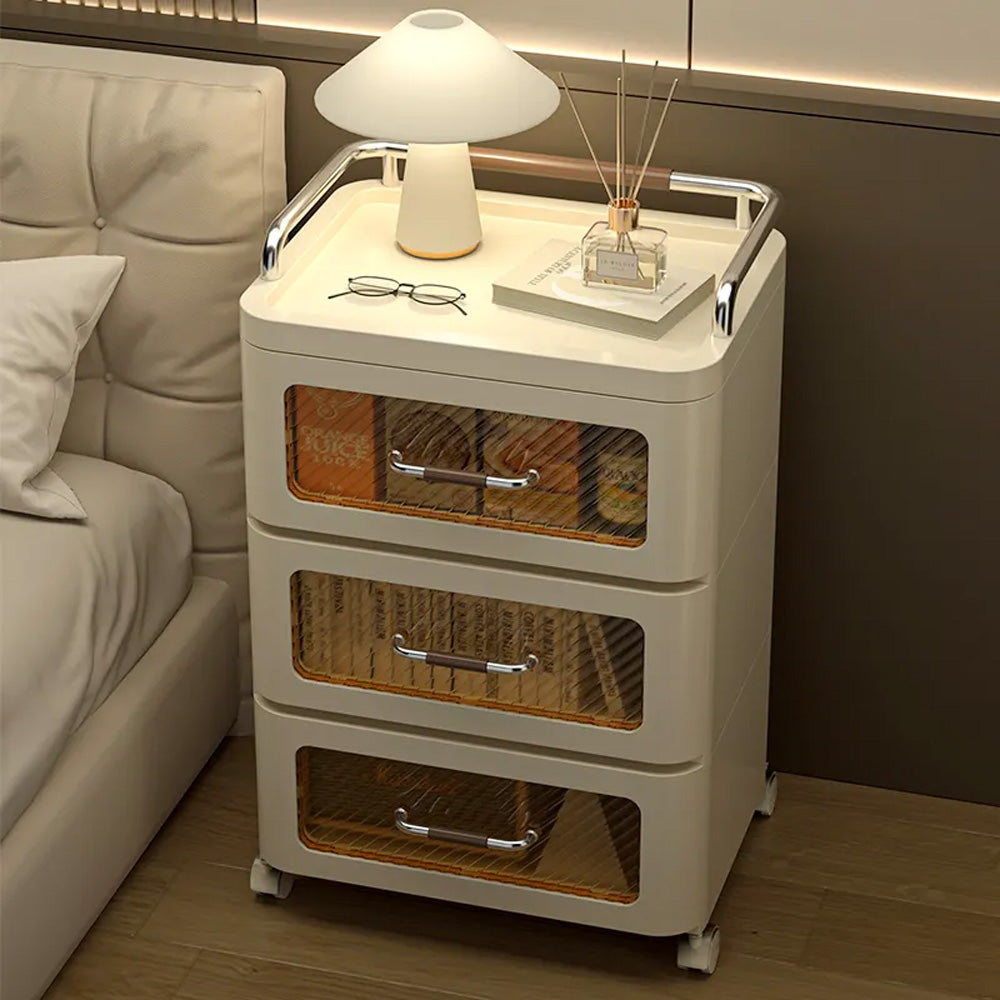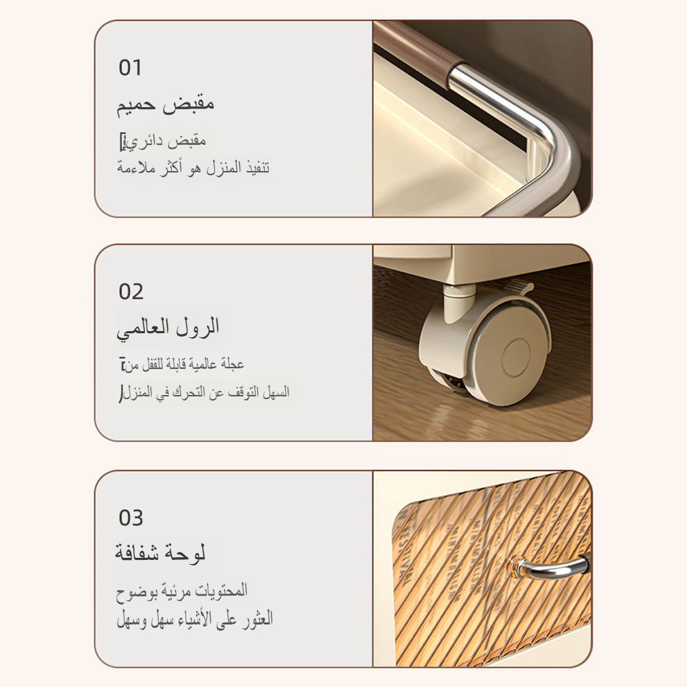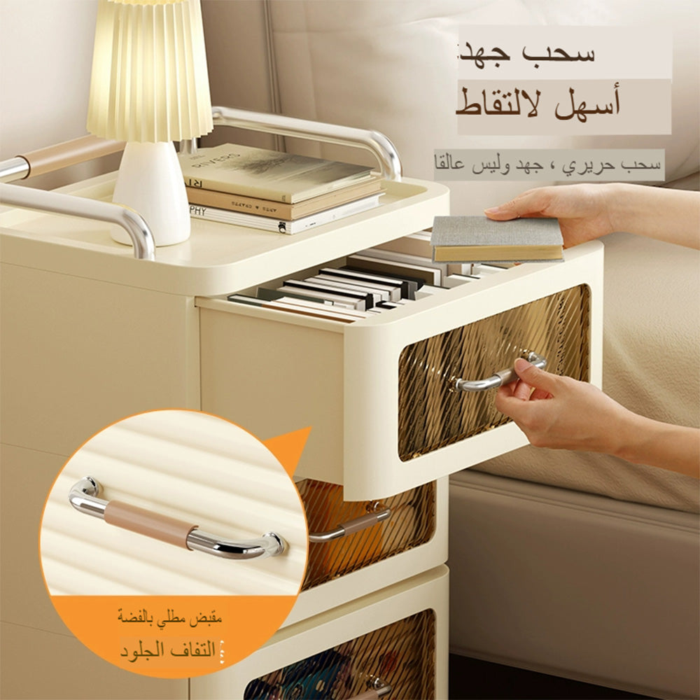 طاولة جانبية بلاستيكية حديثة باللون البني مع أبواب شفافة ودرج بلاستيكي مرن
