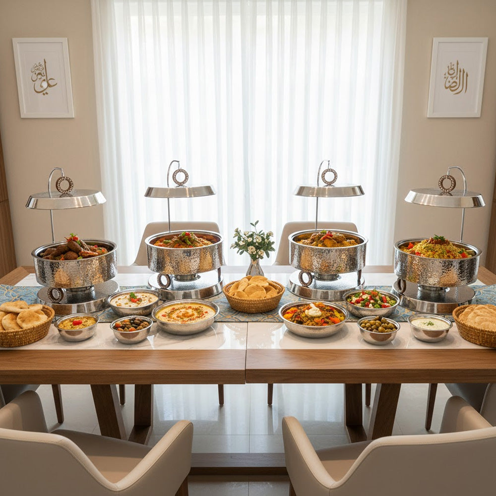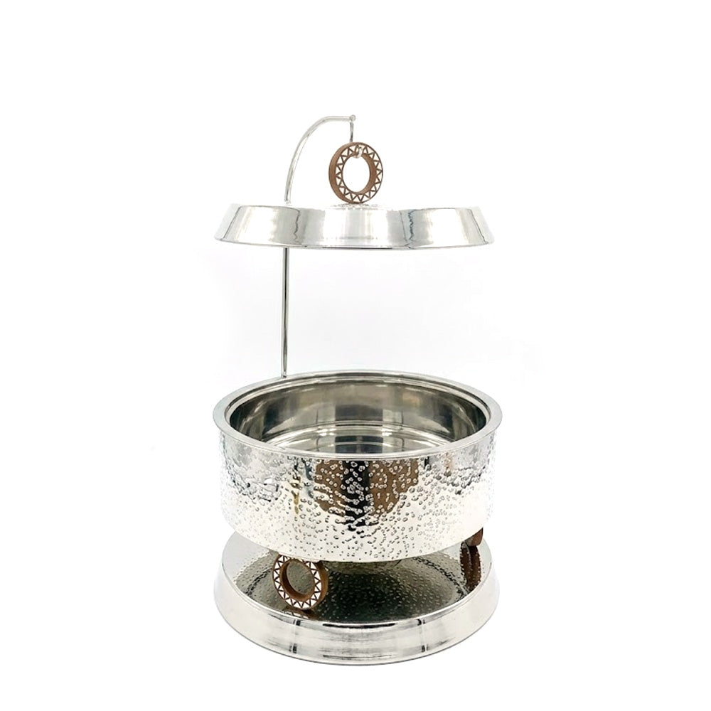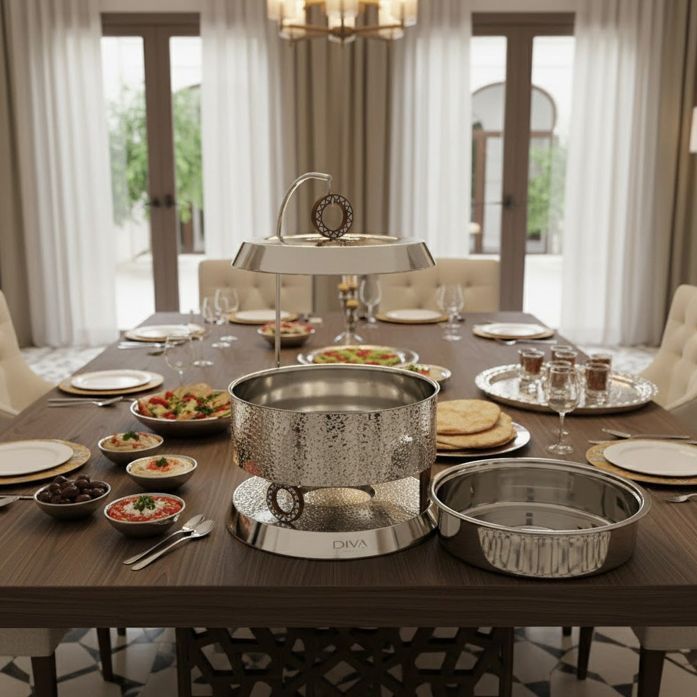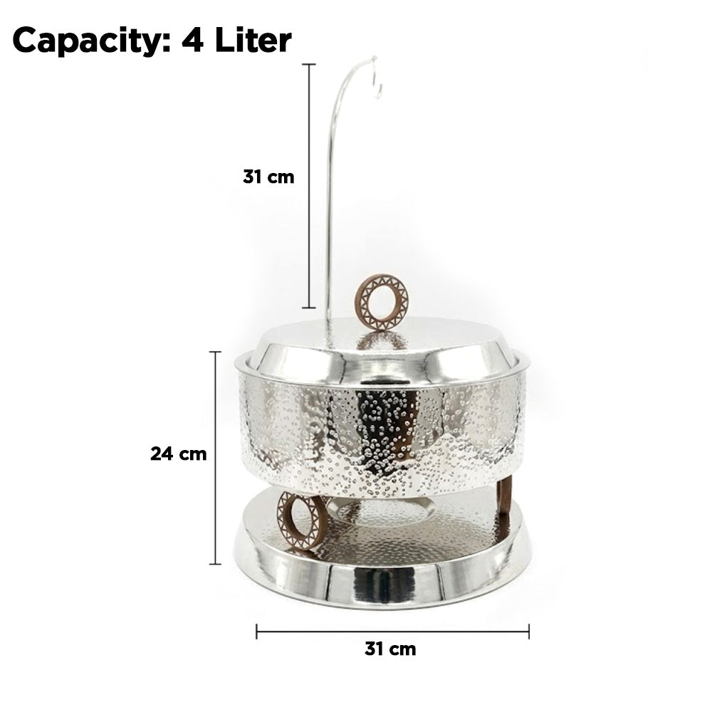 قدّم وجباتك بأناقة مع طبق التسخين الملكي المصنوع من الفولاذ المقاوم للصدأ والمطروق (سعة 4 لترات)، الذي يجمع بين الفخامة والعملية. يتميز هذا الطبق بتصميم فاخر بلمسة نهائية مطروقة لامعة، مما يضفي لمسة جمالية على أي مائدة طعام، من العشاءات الرسمية إلى البوفيهات.
