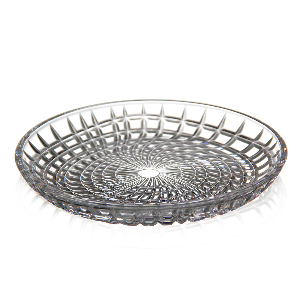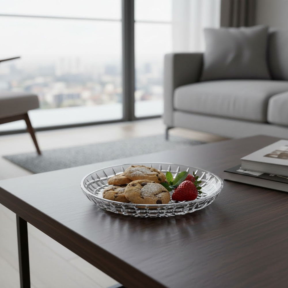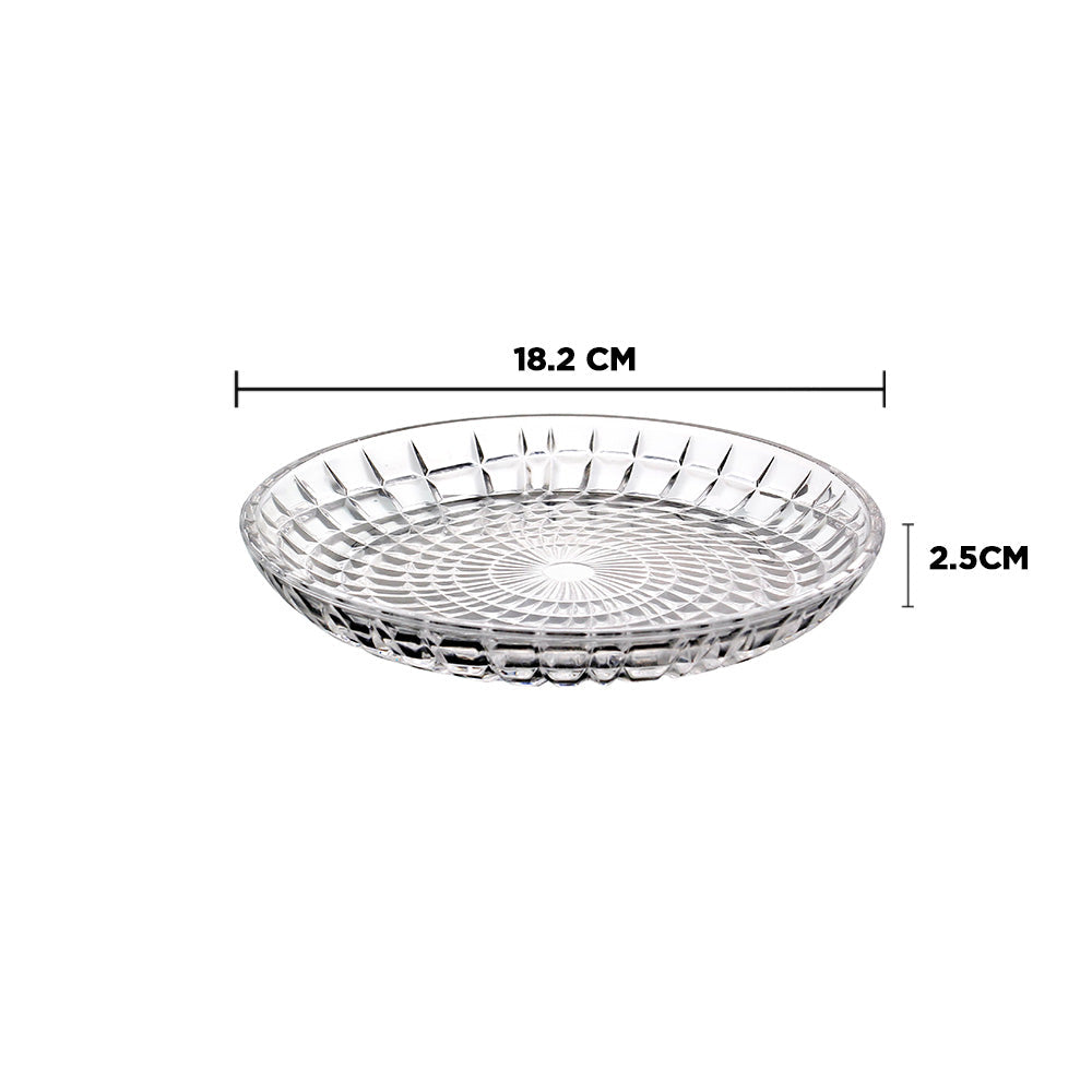 يتميز طبق الحلوى الدائري الأنيق هذا بتصميم كريستالي مزخرف، وقاعدة منقوشة بشكل جميل تعكس الضوء لإضفاء لمسة فاخرة. يبلغ قطره 18.2 سم وارتفاعه 2.5 سم، وهو الحجم المثالي لتقديم الحلويات والمعجنات والمقبلات الصغيرة والوجبات الخفيفة أو حصص الفاكهة.