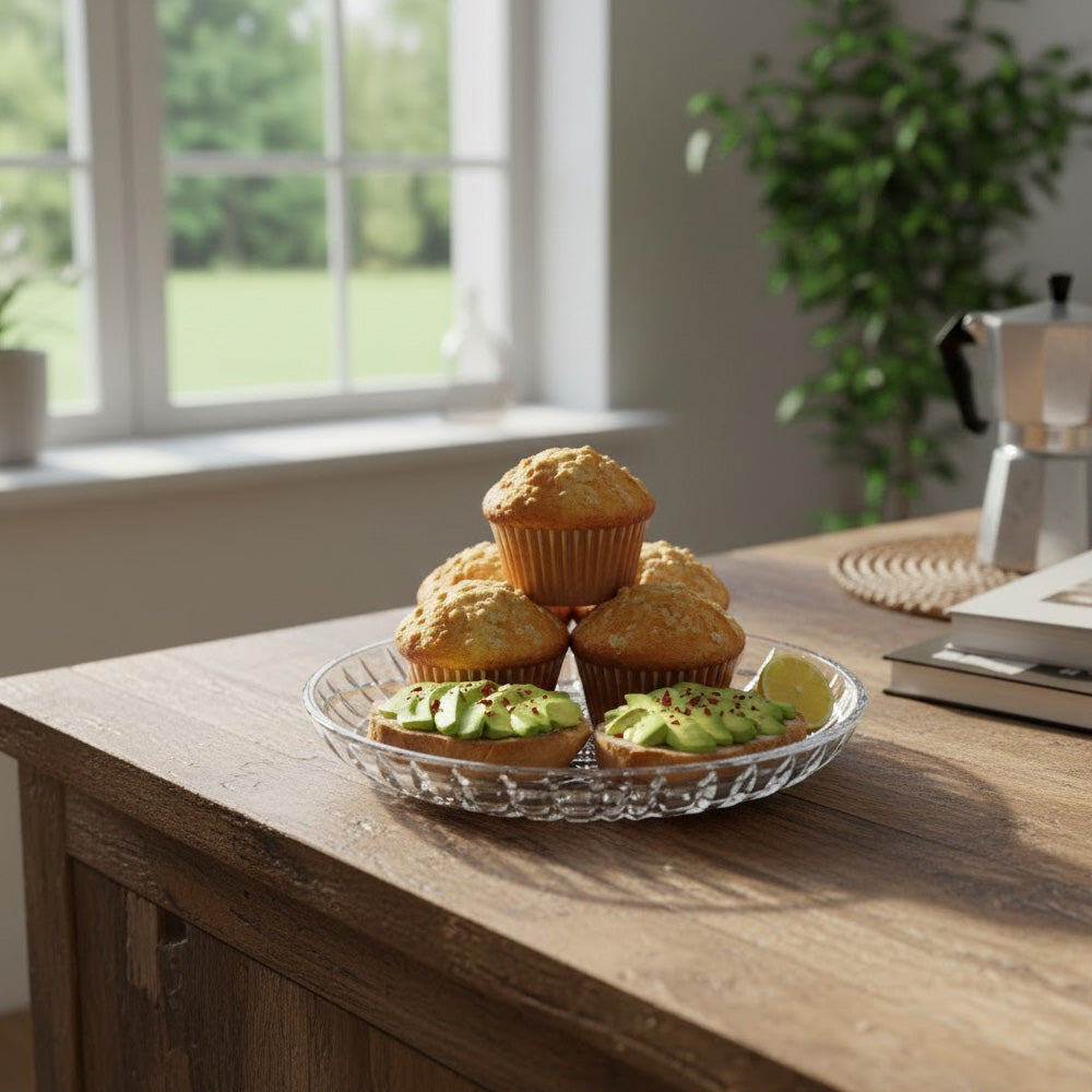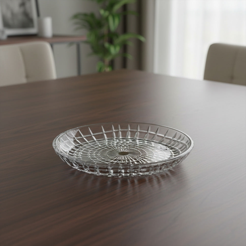 مصنوع من زجاج شفاف ومتين، يضفي هذا الطبق لمسة راقية على أي طاولة، مثالي للاستخدام اليومي والمناسبات الخاصة والمقاهي وبوفيهات الطعام. يجمع تصميمه المتقن بين العملية والأناقة، مما يجعله قطعة مائدة عملية وزخرفية في آن واحد.