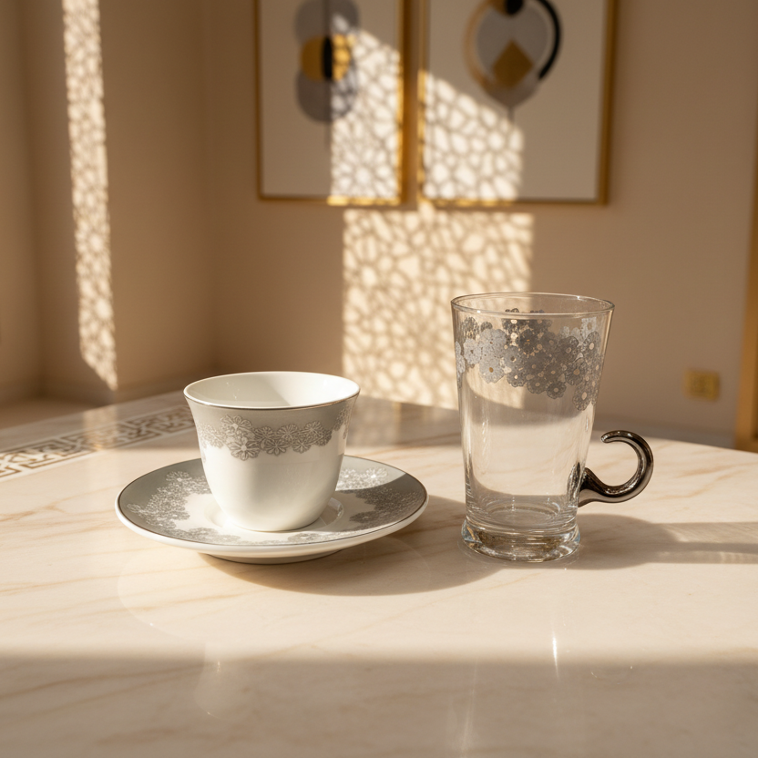 طقم ضيافة أنيق بتصميم عصري ولمسة فاخرة، مثالي لتقديم القهوة العربية، القهوة التركية، أو المشروبات الساخنة في المناسبات والضيافة اليومية.