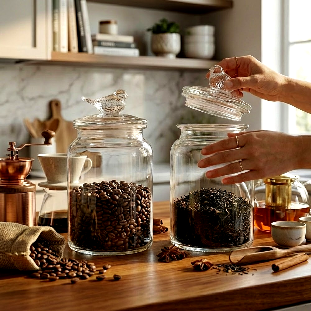أضف لمسة من الأناقة والدفء إلى مطبخك مع طقم علب التخزين الزجاجية بغطاء على شكل طائر، حيث يجمع بين الوظيفة العملية والتصميم الجمالي الراقي.