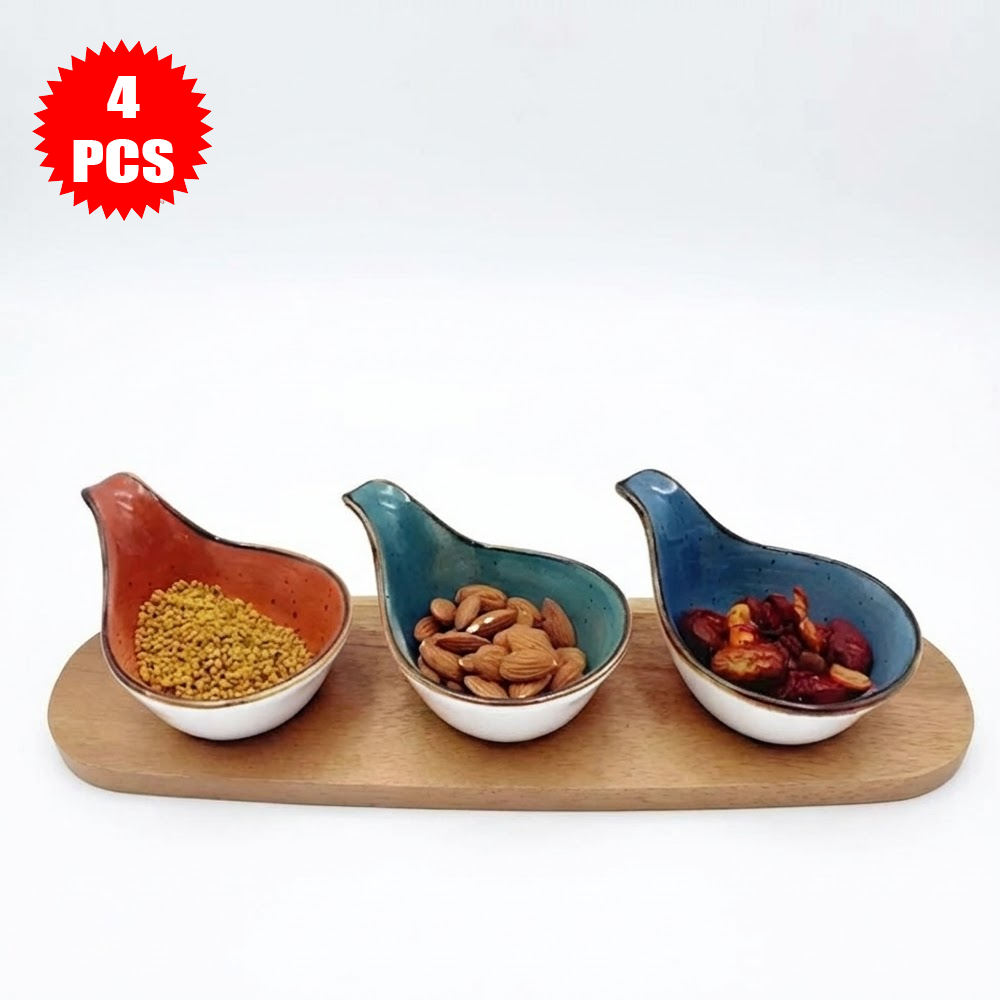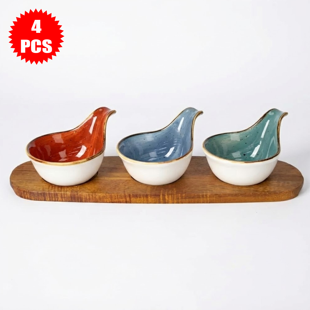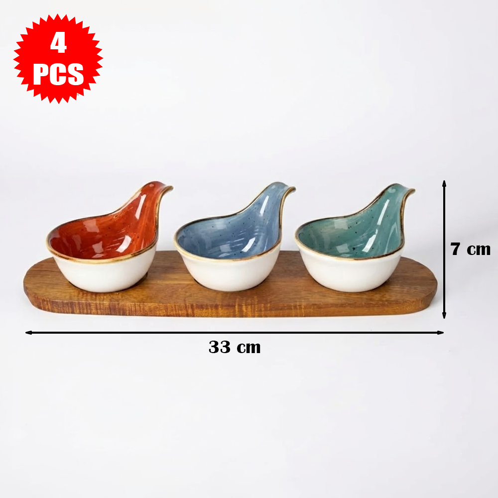 طقم تقديم خشب أكاسيا مع أوعية سيراميك ملونة – 4 قطع بتصميم أنيق وعصري