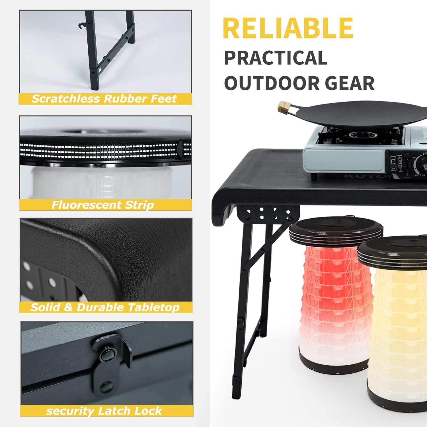سهل الإعداد بدون أدوات - يستغرق الأمر بضع دقائق فقط لفضح الطاولة لخارج منزلك أو حدثك. افتح المزلاج وافتح جانب هذه الطاولة أثناء فتح حقيبتك. اسحب كل ساق للخارج واضغط على مزلاج الأمان لجعله ثابتًا قبل الاستخدام. ثم أخرج المقعد القابل للطي LED واضبطه على ارتفاعك. يمكنك استخدامه ليلاً أو نهارًا بفضل المقعد المحمول LED (لا يتم تضمين بطاريتين AA) مع 3 أوضاع إضاءة بعد الشحن. هناك ضوء دافئ وضوء وامض ملون وضوء تحذير للاختيار من بينها.