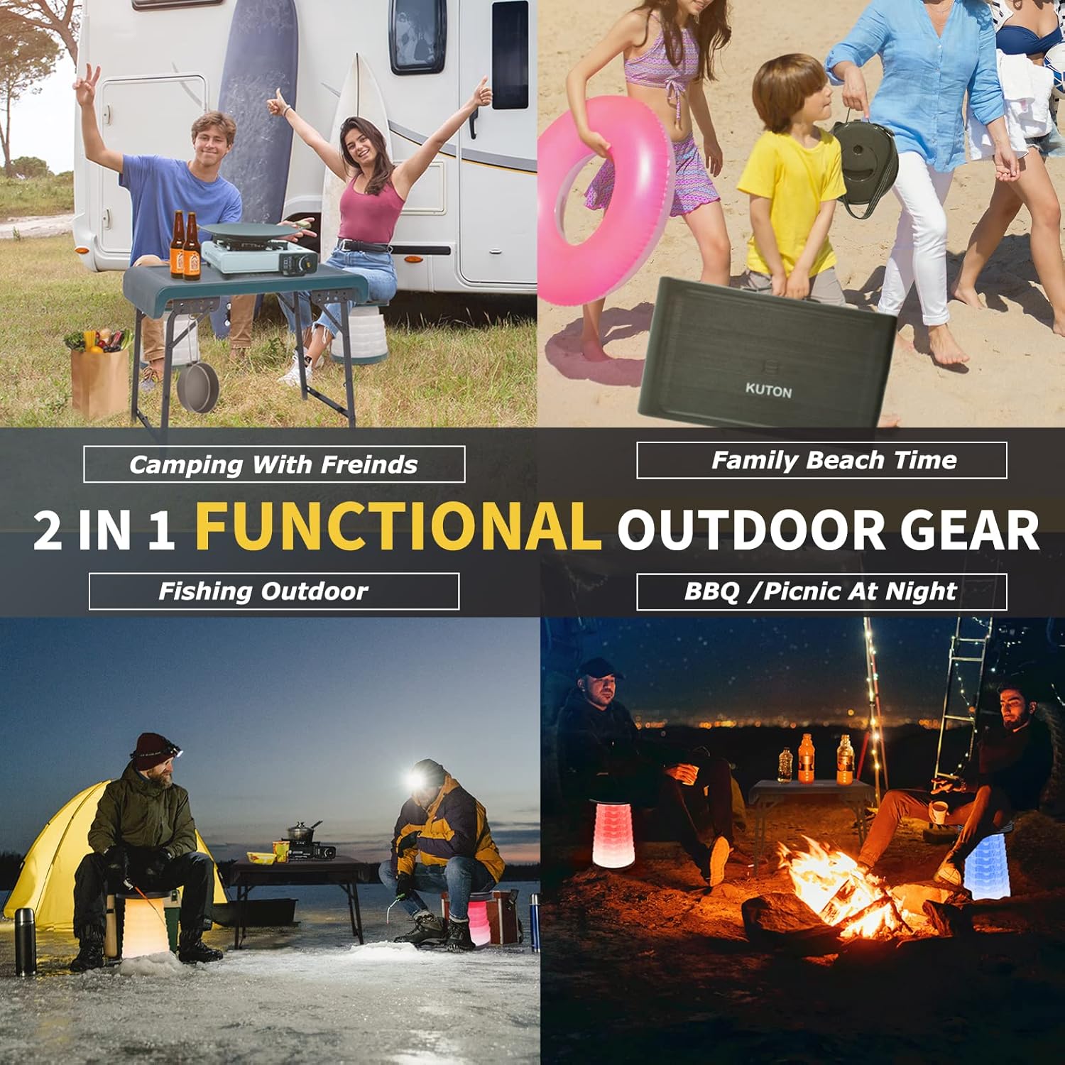 طقم كراسي طاولة عملي 2 في 1 مناسب للمناسبات الخارجية والداخلية - تأتي مجموعة طاولة كوتون مع طاولة محمولة (ارتفاع 21.3 بوصة) مع مقعدين قابلين للطي بإضاءة ليد، وهو مناسب للصيد أو النزهة أو التخييم أو في الفناء أو لقضاء وقت عائلي أو أكثر. يمكنك استخدامه بشكل منفصل. بالنسبة للكرسي، يمكنك استخدامه ككرسي متدرج أو كرسي صيد أو عمل زراعي. يمكن أيضًا استخدام هذه المجموعة بالكامل كطاولة جانبية للقهوة، أو حتى كمحطة عمل أو أكثر للأنشطة الداخلية.