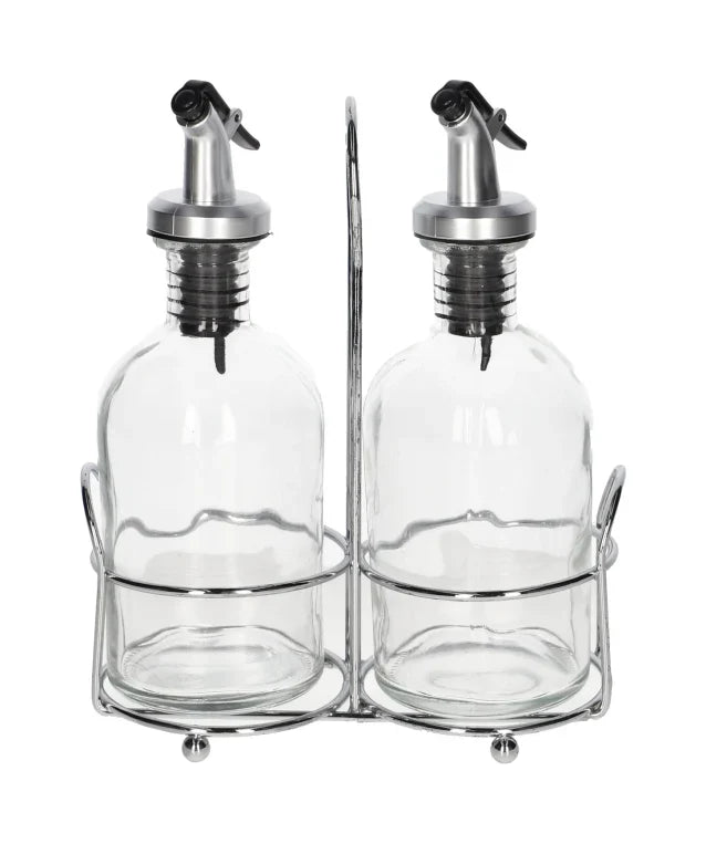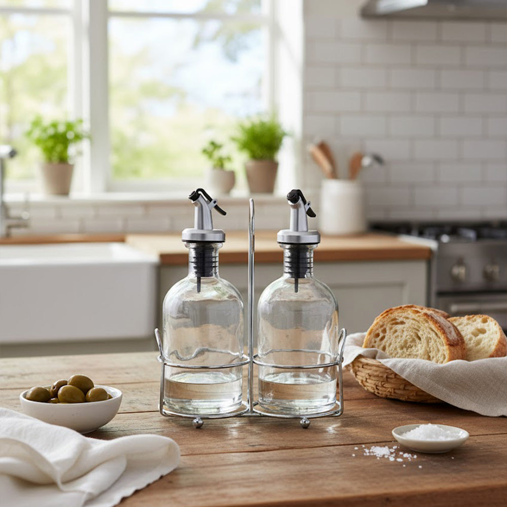 حسّني خزانة مؤنك مع طقم زجاجات الزيت والخل الأنيق. تصميم عصري يناسب أي مطبخ. مزود بغطاء مطاطي محكم الإغلاق يحافظ على نضارة الطعام.