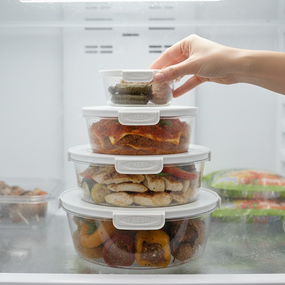 حافظي على طعامك طازجًا ومنظّمًا مع طقم علب حفظ الطعام الدائرية المصنوعة من خامات عالية الجودة، والمصممة لتلائم احتياجات التخزين في المطبخ والثلاجة وتنظيم الوجبات اليومية.