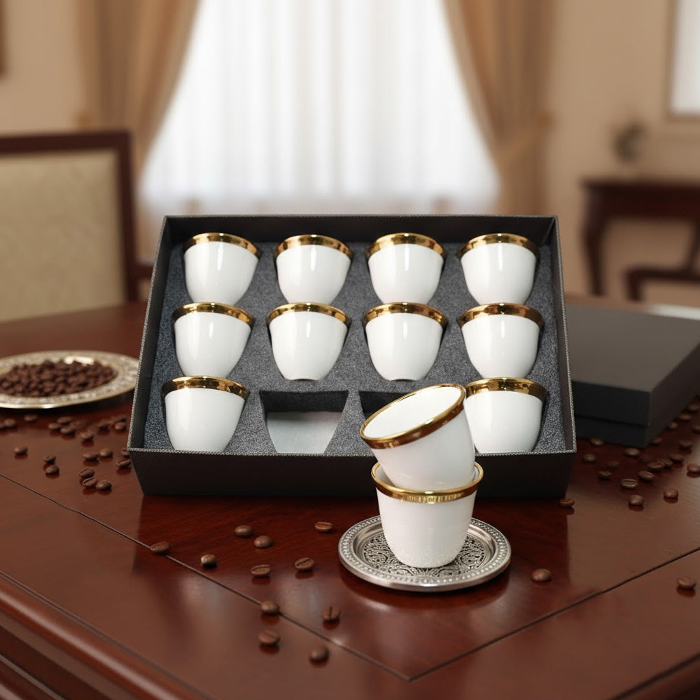 قدّم لضيوفك أناقةً خالدة مع طقم فناجين القهوة العربية الفاخر هذا. مصنوع بخبرة من البورسلين الفاخر، كل كوب مصمم ليمنحك الراحة والرقي. يتضمن الطقم اثني عشر فنجانًا بلمسة نهائية رائعة، مُقدمة في علبة هدايا فاخرة، مثالية للتجمعات، أو الضيافة، أو كهدية فاخرة للمناسبات الخاصة. متين، مقاوم للحرارة، وسهل التنظيف، يجمع هذا الطقم بين العملية والأناقة الراقية لكل لحظة قهوة.