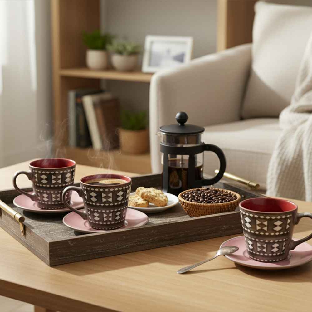 أضف لمسة فنية إلى ضيافتك مع هذا الطقم الأنيق من الفناجين والصحون المصنوعة من الخزف عالي الجودة.