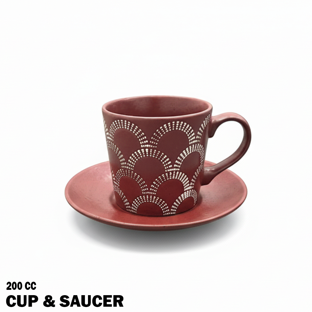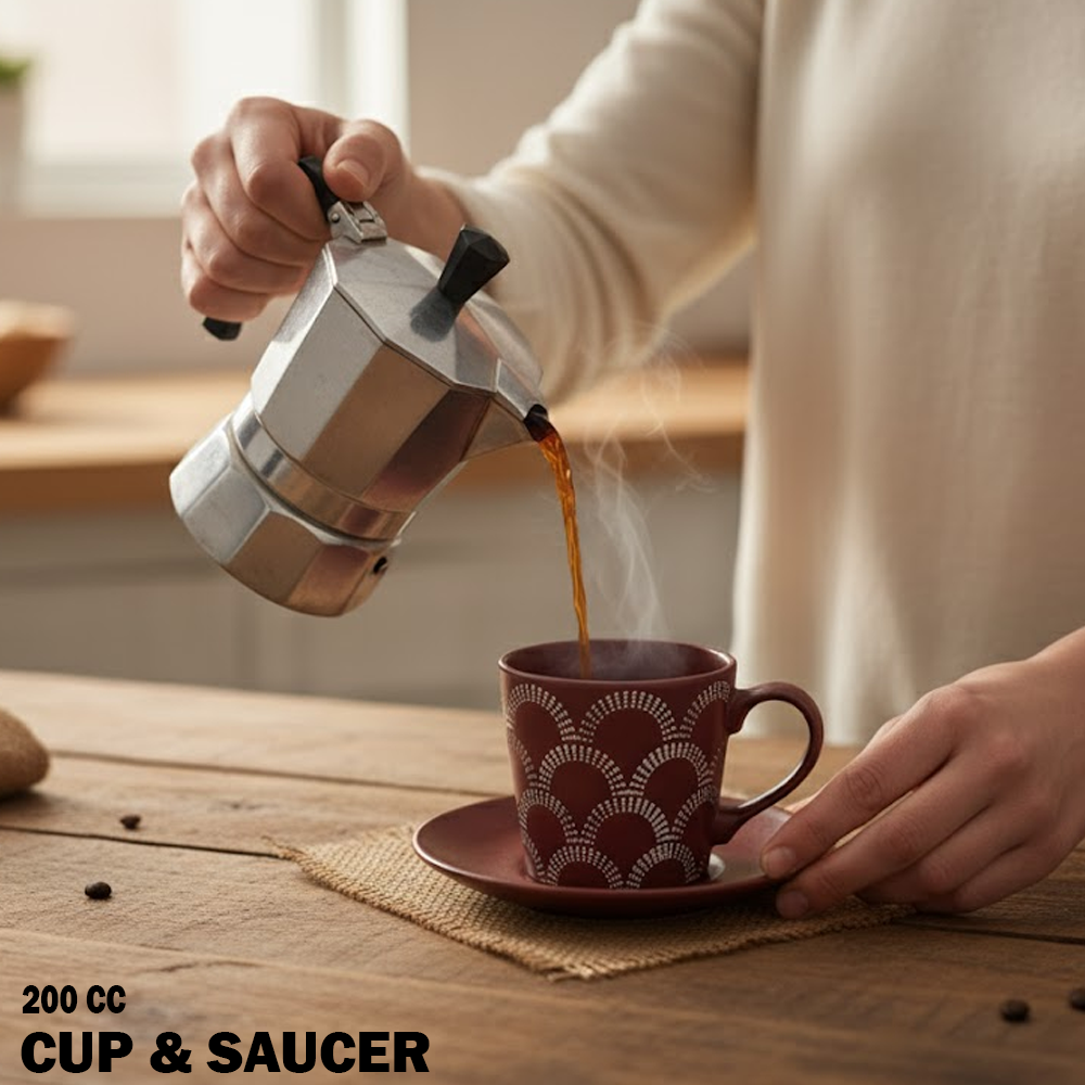 يتميز بلونه الأحمر الغامق المميز وتصميمه العصري المزخرف بخطوط بيضاء أنيقة تضيف لمسة فنية إلى كل فنجان.