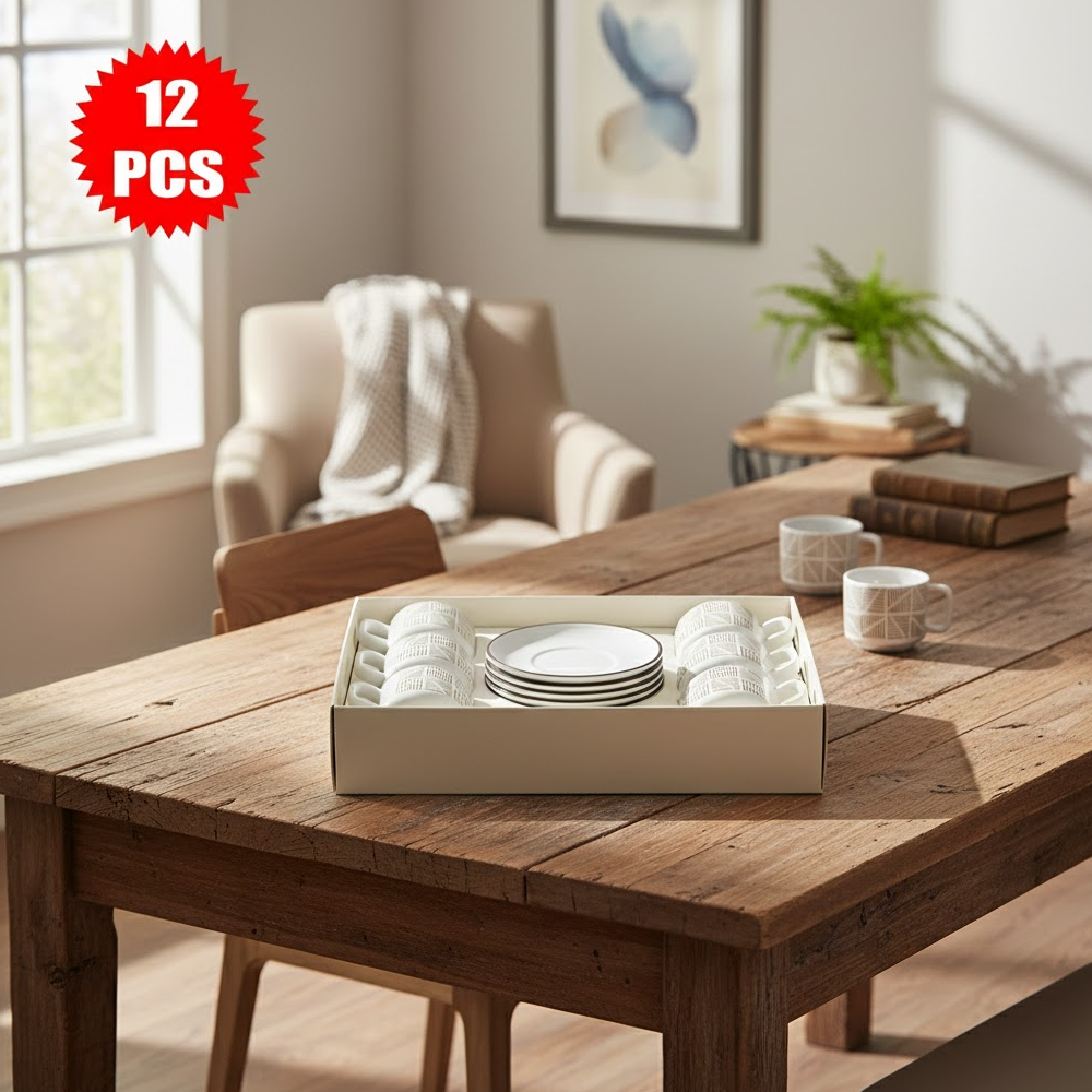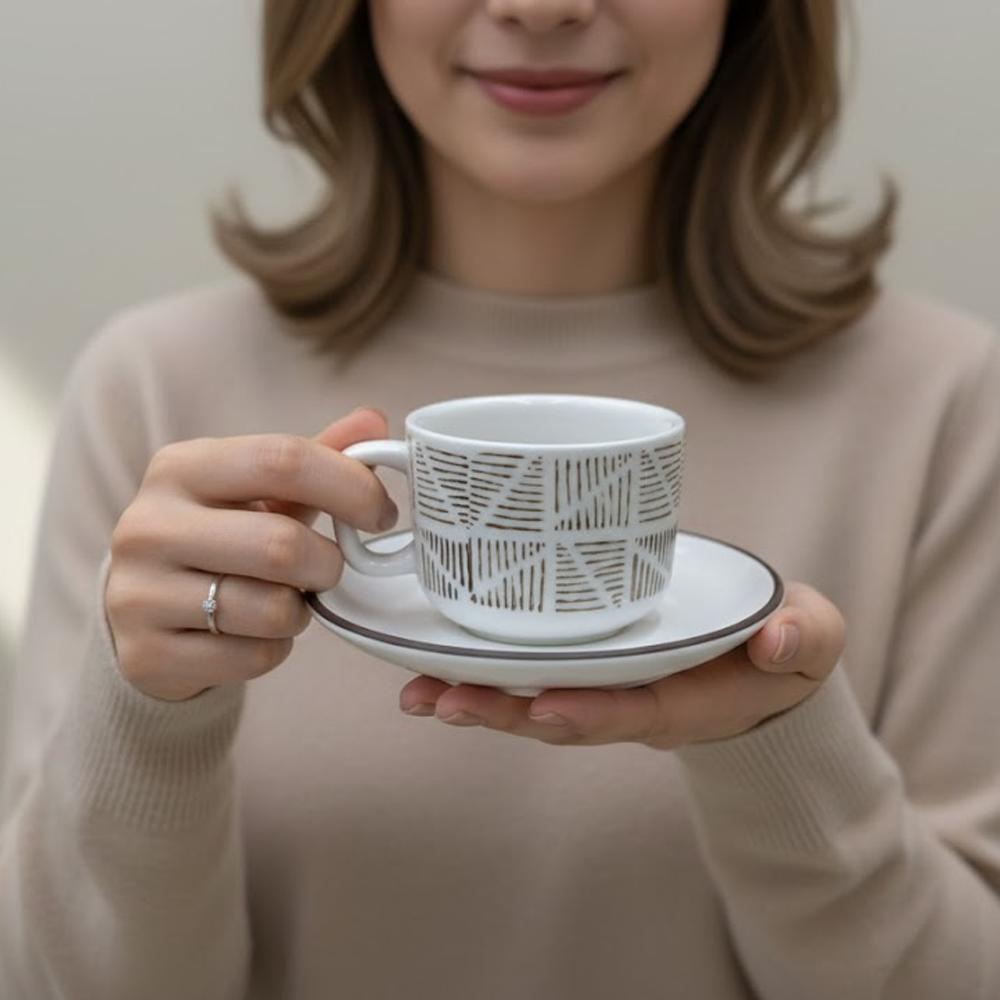 استمتع بتجربة قهوة راقية مع طقم فناجين القهوة الأنيق المصمم بذوق عصري ولمسة فنية هادئة. يتميز الطقم بنقوش هندسية أنيقة تضيف جمالًا بصريًا مميزًا، مع لون أبيض راقٍ وحواف دقيقة تمنح الفناجين مظهرًا فخمًا يناسب جميع الأذواق.
