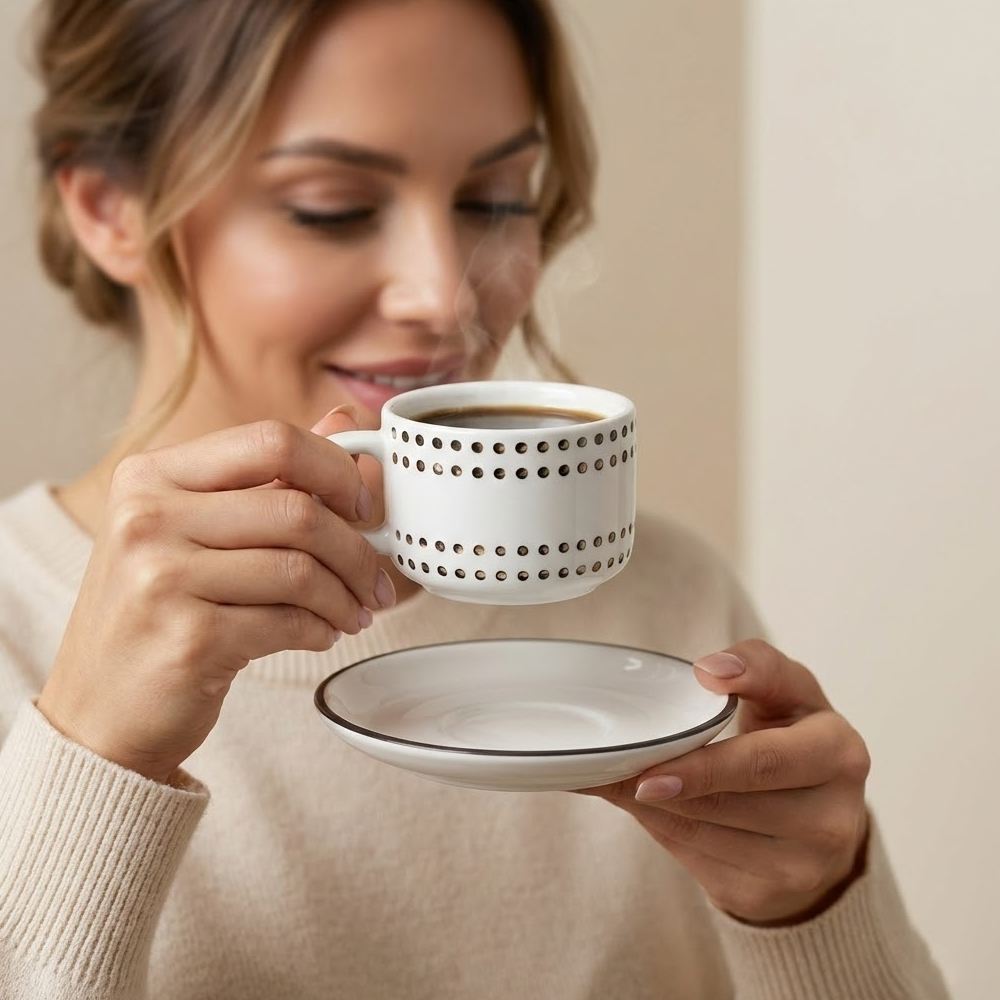 صُممت الفناجين بمقبض مريح للحمل، مع صحون أنيقة بحواف دقيقة تضيف لمسة فخامة وتحافظ على ثبات الفنجان. الطقم مثالي للاستخدام اليومي، الضيافة، أو تقديمه كهدية أنيقة لمحبي القهوة.