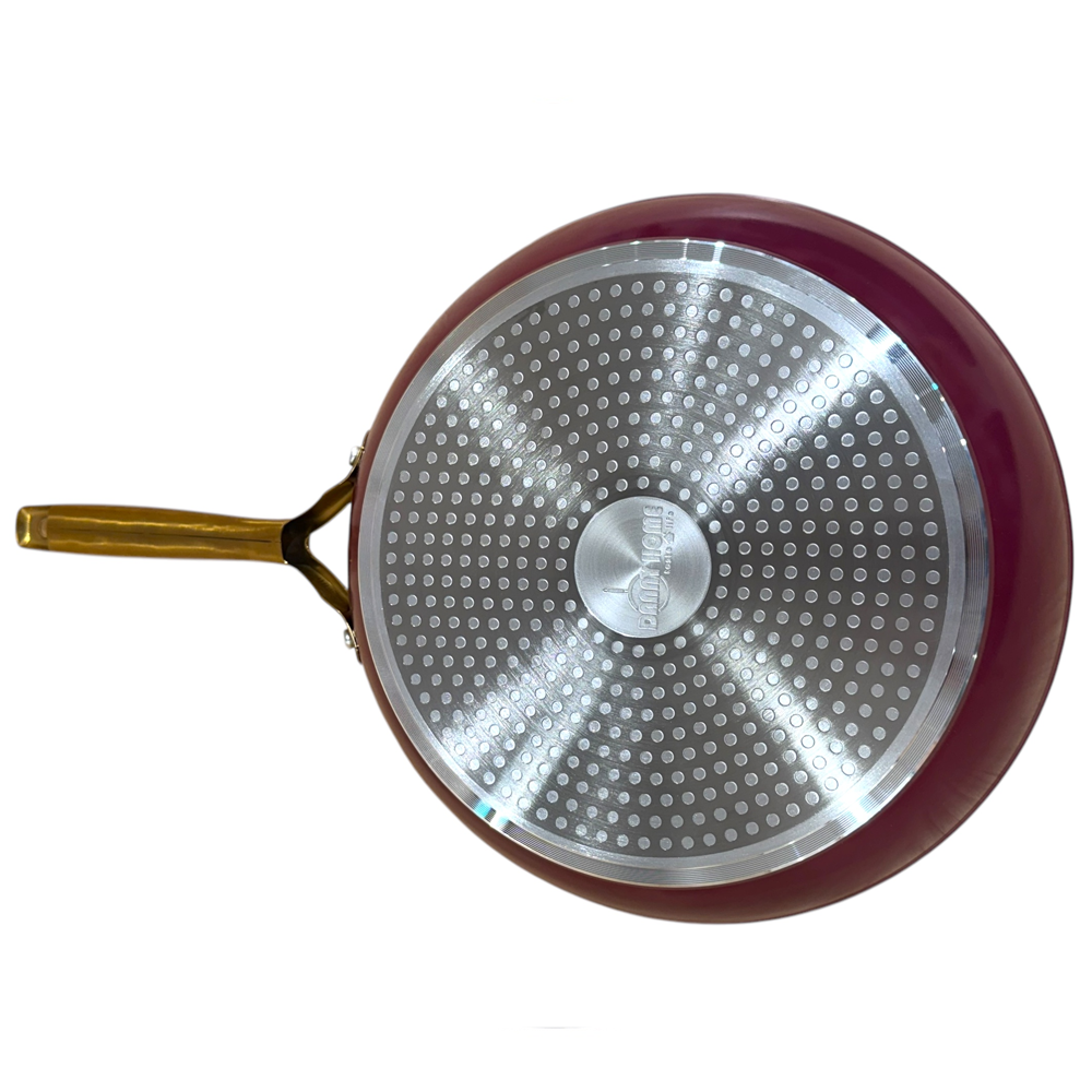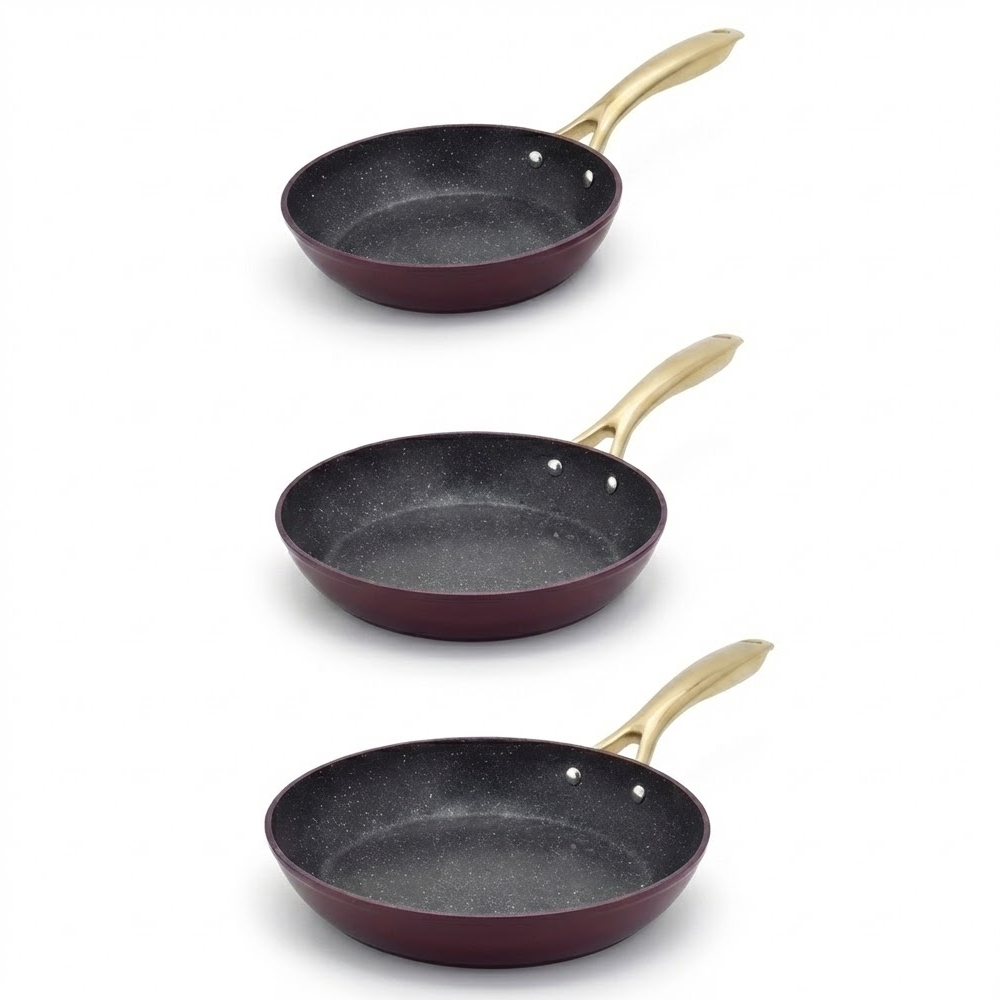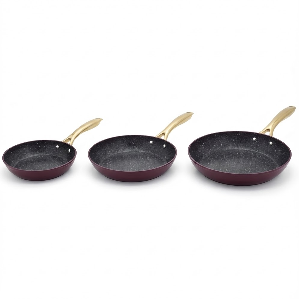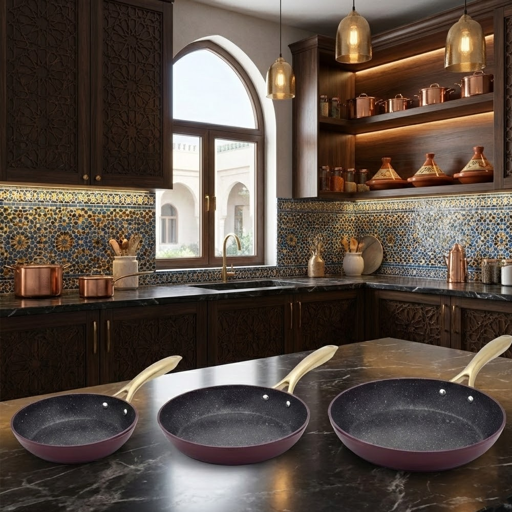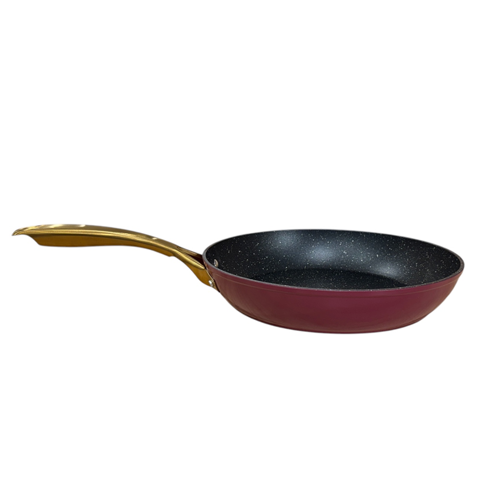 امنحي مطبخك لمسة من الفخامة مع طقم المقالي الجرانيت عالي الجودة، المزود بطبقة غير لاصقة قوية تضمن طهيًا صحيًا بدون استخدام الكثير من الزيت. المقلاة تأتي بتصميم أنيق بلون خمري مع مقبض ذهبي فاخر يمنحك إحساسًا بالرفاهية والتميز.