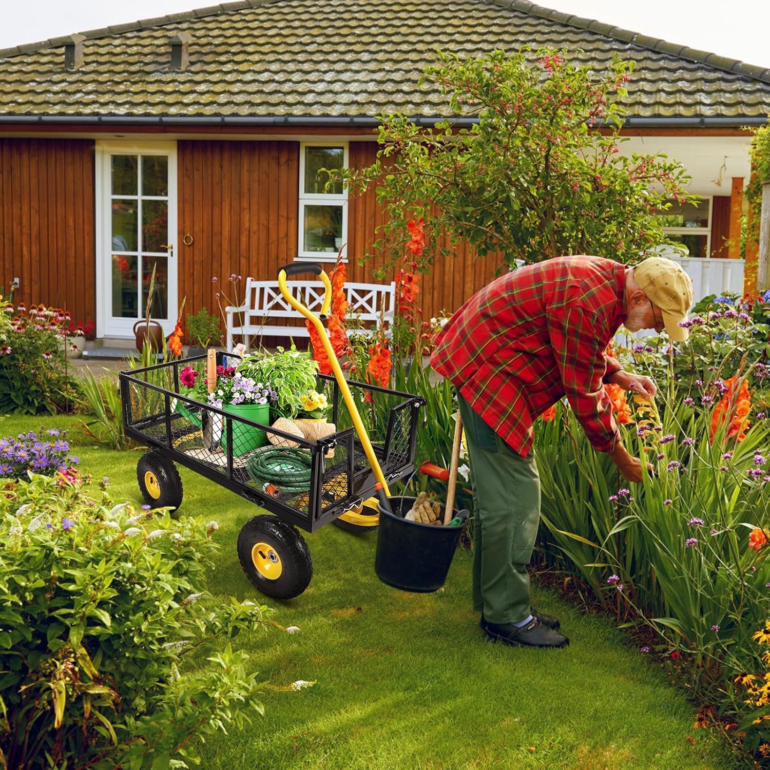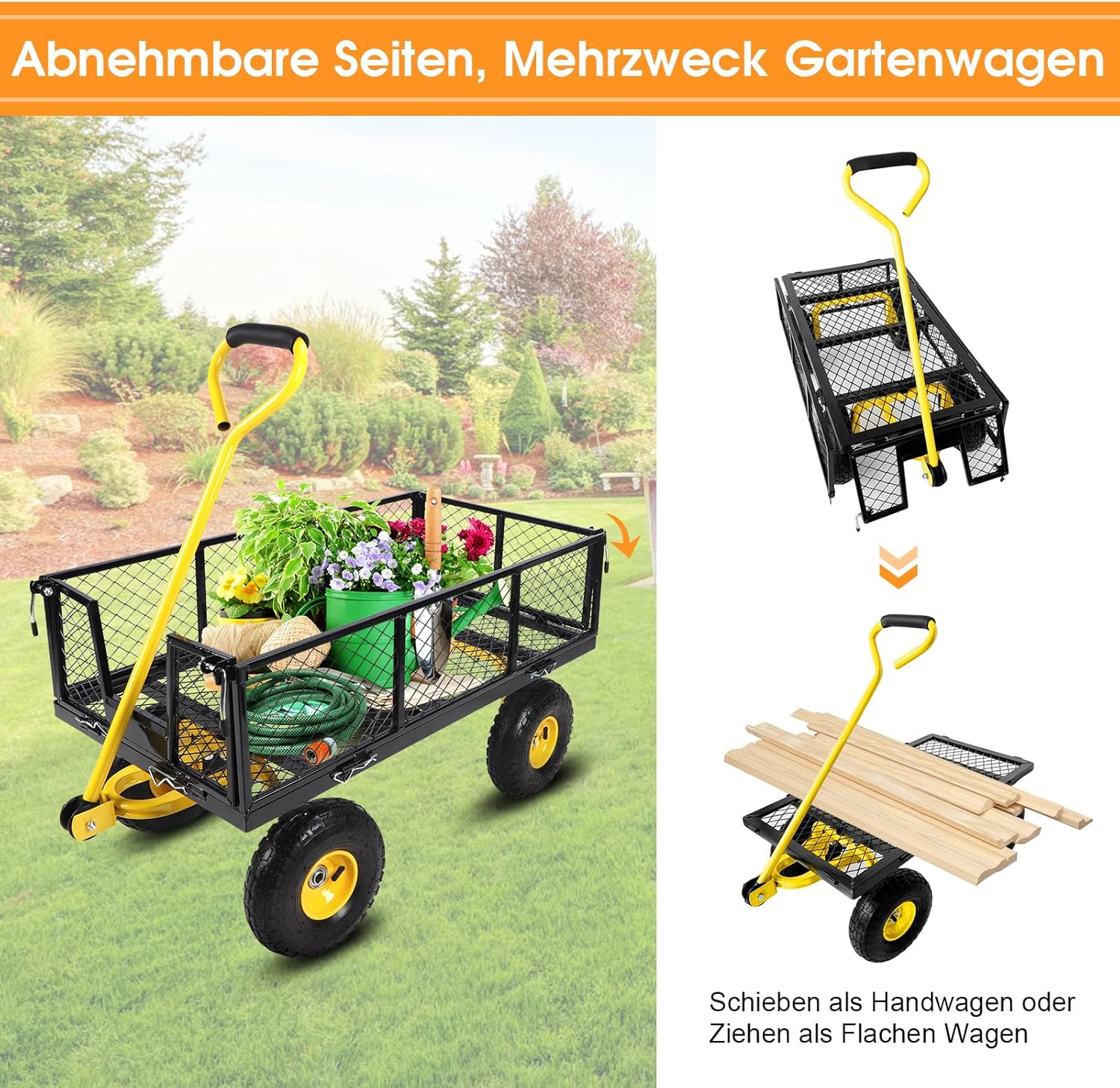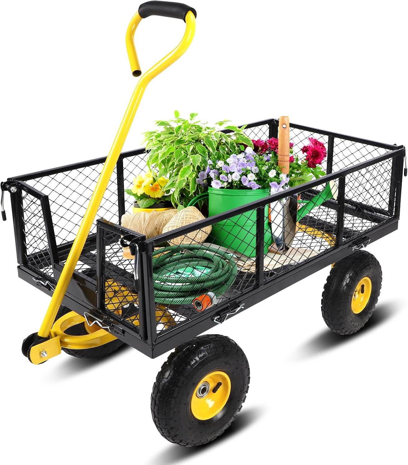 4. متعددة الوظائف: سواء كنت تستخدم عربة الحديقة هذه لنقل الأدوات أو معدات الزراعة، أو تحميل الخشب، أو تخزين الفوضى، أو كعربة لنقل الأطفال أو الحيوانات الأليفة، فهي تحتوي على كل ما تحتاجه.