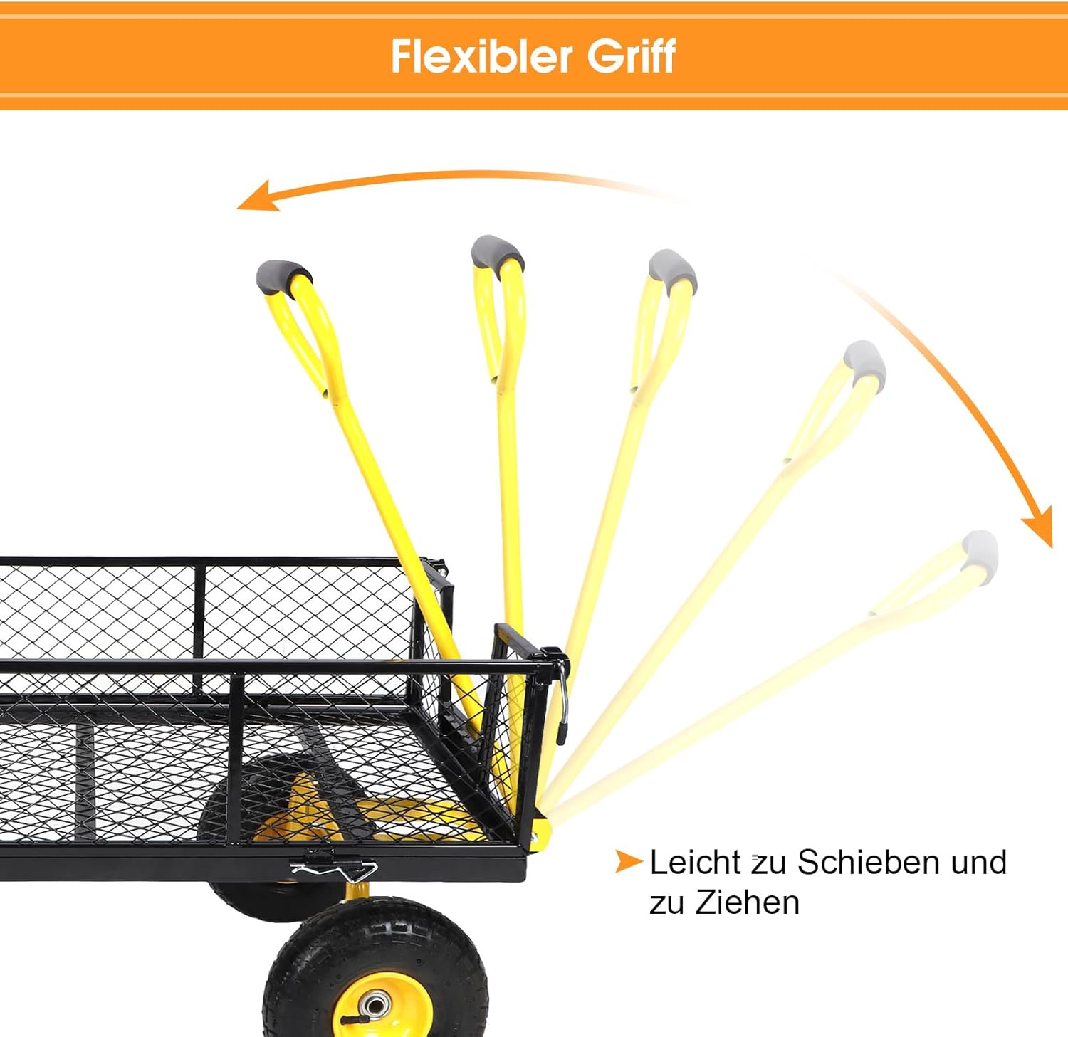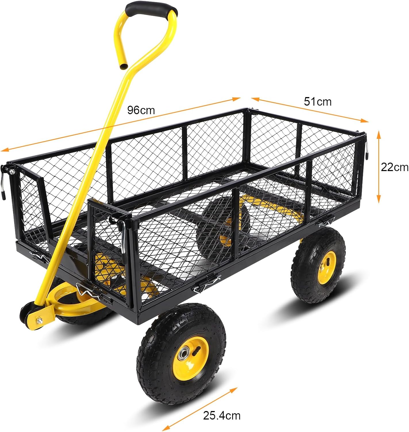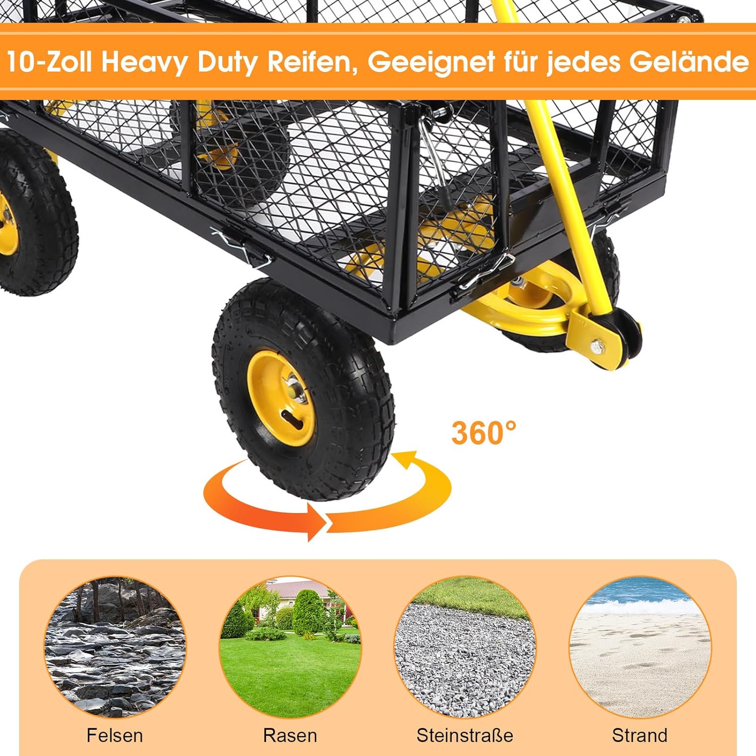 إطارات 3.10 بوصة: عربة حديقتنا مجهزة بإطارات 10 بوصة، مستقرة وآمنة للاستخدام. بفضل وظائف تقليل الضوضاء وامتصاص الصدمات، فهو مناسب جدًا للعشب والثلج والشاطئ والصخور وما إلى ذلك.