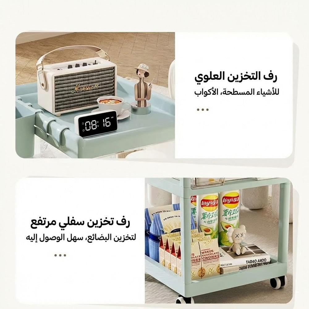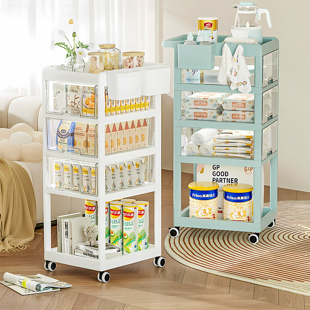 حافظ على مساحتك مرتبة ومنظمة وأنيقة مع عربة التخزين المتنقلة ذات الأربعة أرفف، المصممة لتوفير أقصى درجات الراحة والمتانة. مصنوعة من مواد البولي بروبيلين والبولي إيثيلين تيريفثالات عالية الجودة، هذه العربة آمنة وخالية من الروائح، ومثالية للاستخدام اليومي في المنازل التي بها أطفال رضع وعائلات.