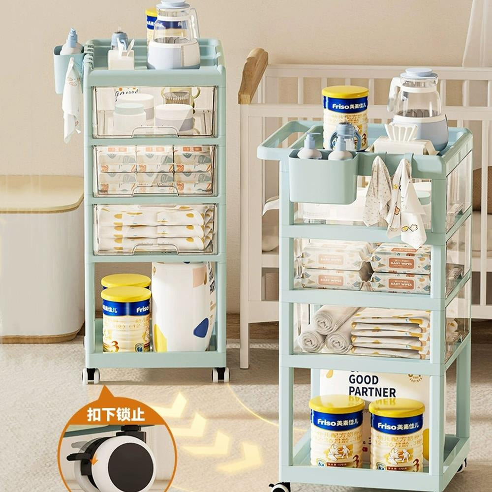 تتميز بثلاثة أدراج شفافة قابلة للسحب، ومساحة تخزين سفلية مرتفعة، ورف علوي مفتوح لسهولة الوصول إلى الأغراض المستخدمة بكثرة. تتيح العجلات سهلة الحركة المزودة بخاصية القفل سهولة النقل مع الحفاظ على ثبات العربة عند الحاجة. تركيبها سهل وسريع بدون أدوات.