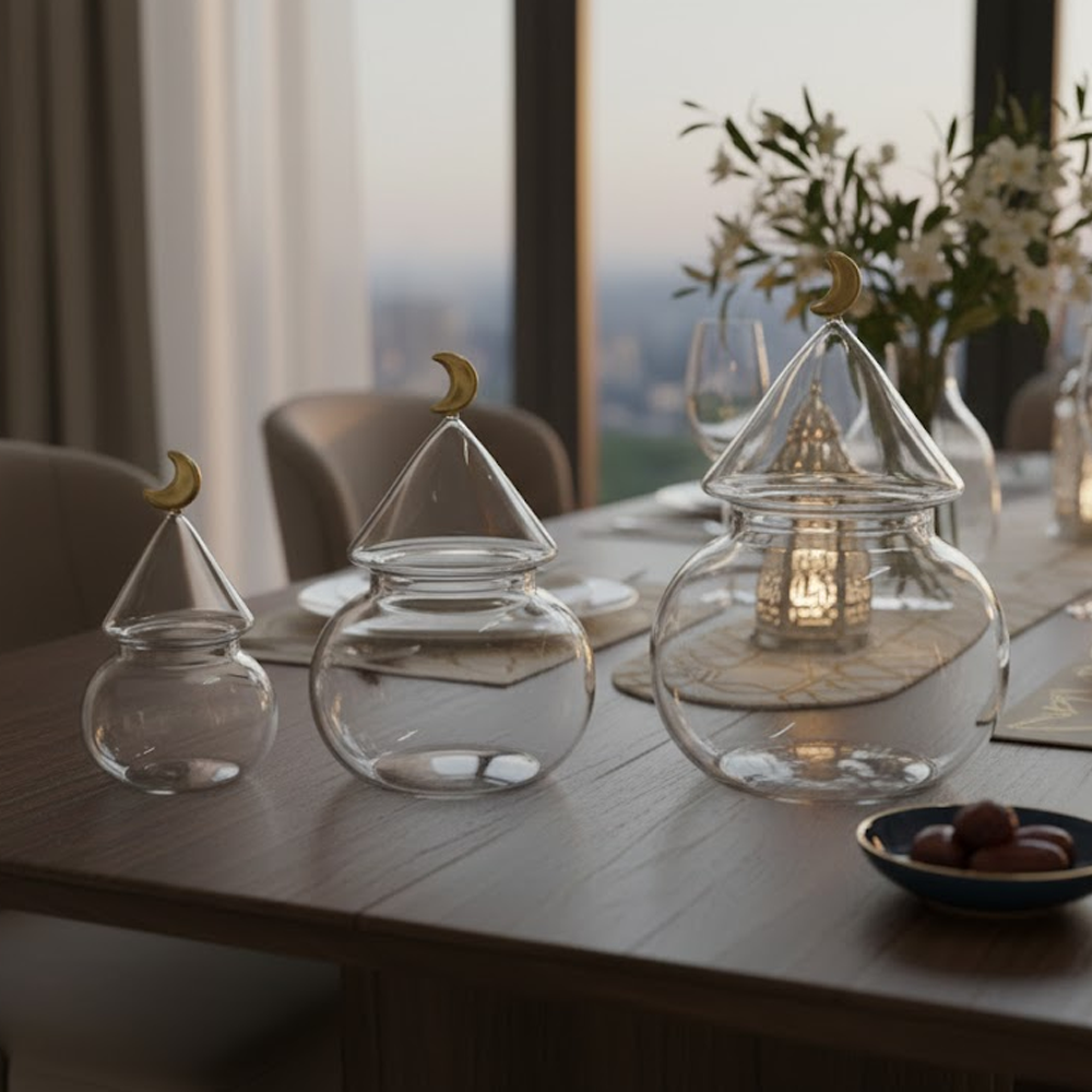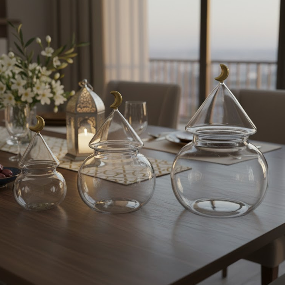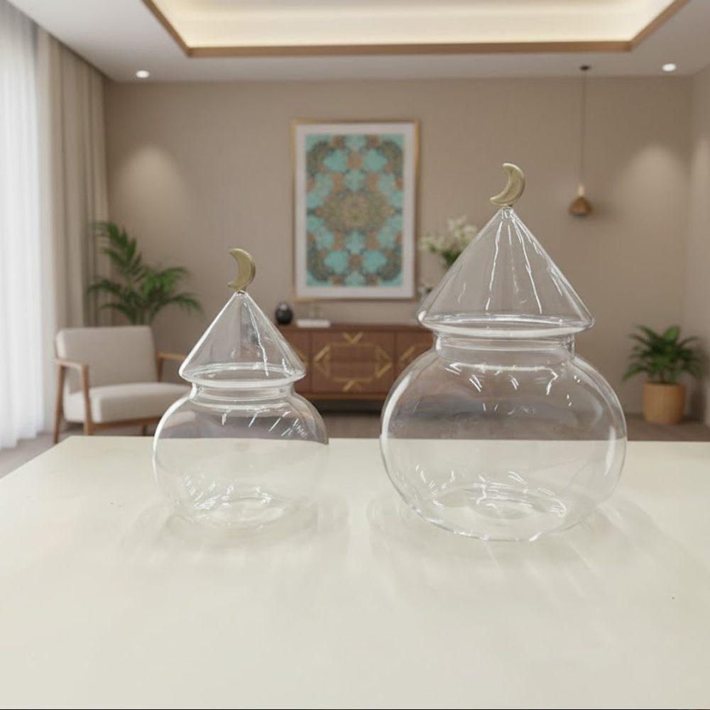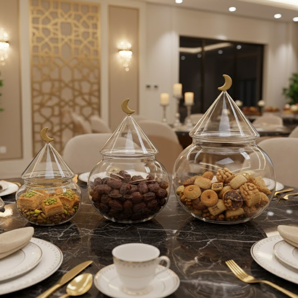 الزجاج الشفاف يبرز المحتوى بشكل جميل، بينما الغطاء المخروطي مع الهلال الذهبي يمنح الطقم طابعًا فخمًا يليق بالمناسبات الخاصة والاستقبال اليومي.