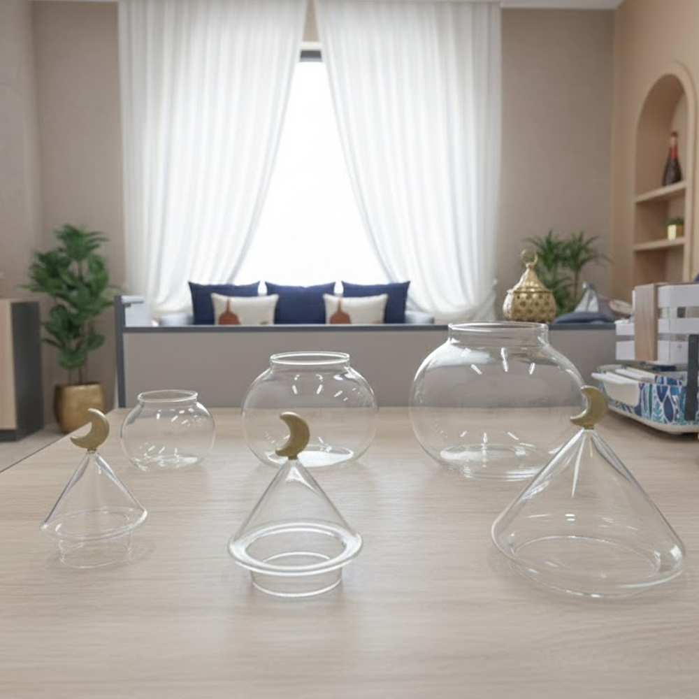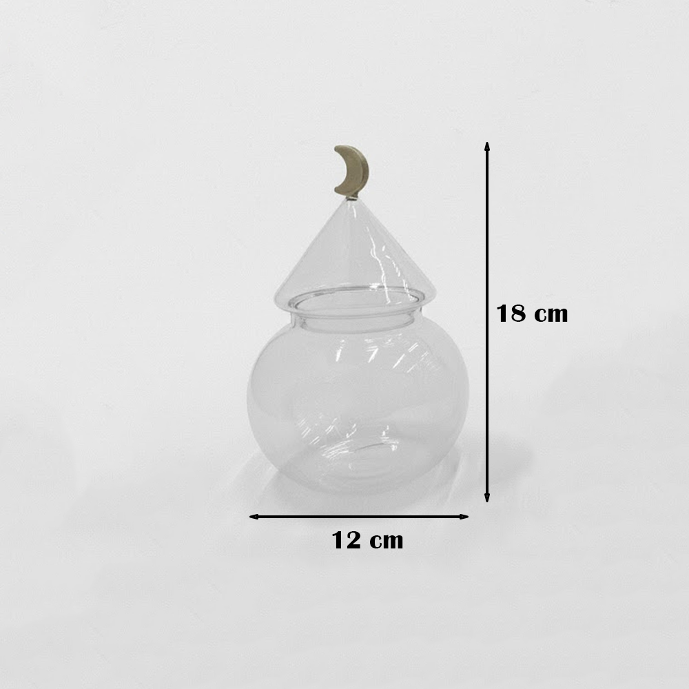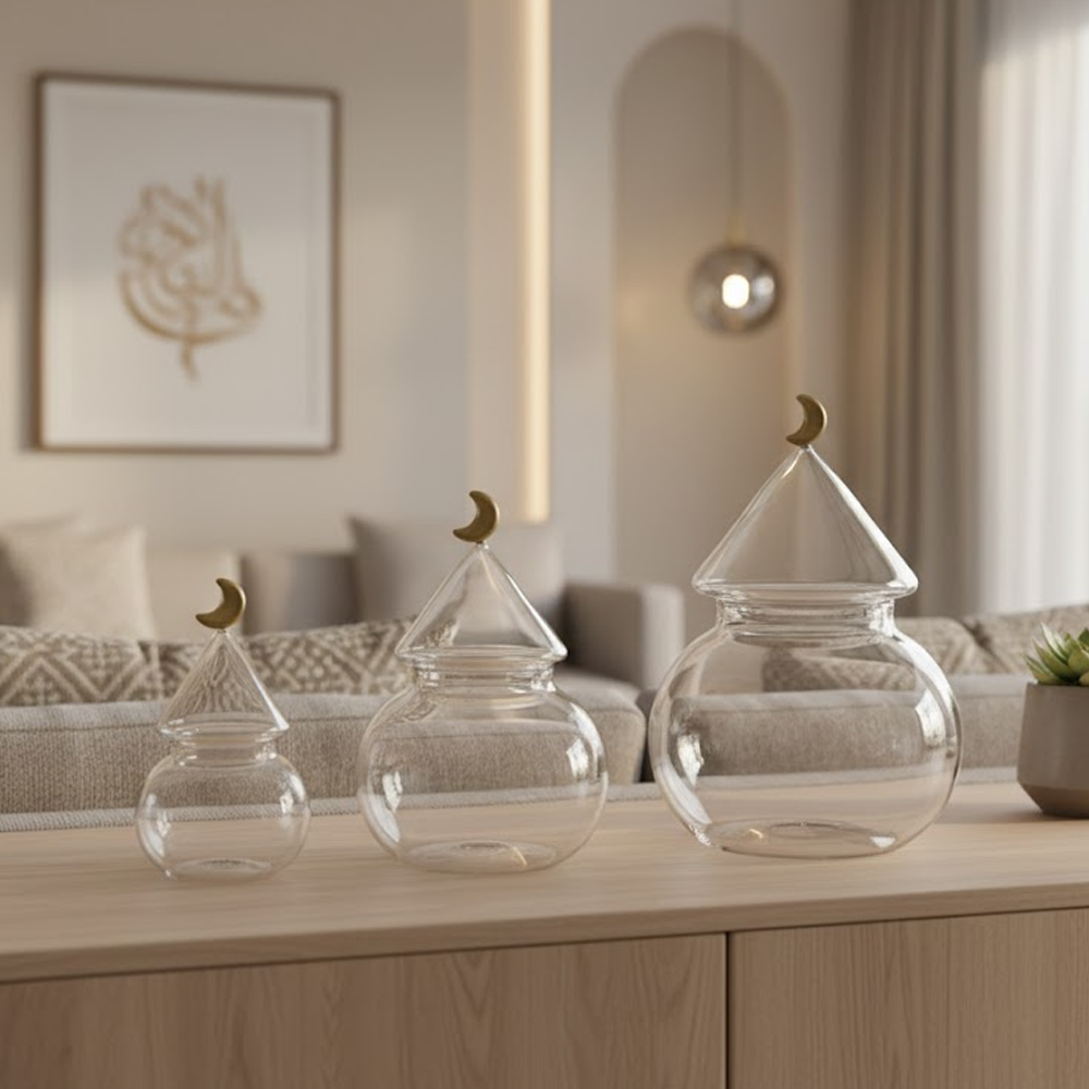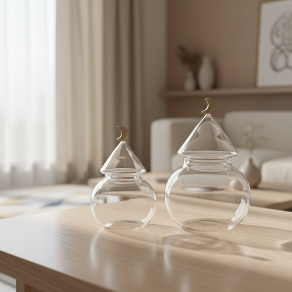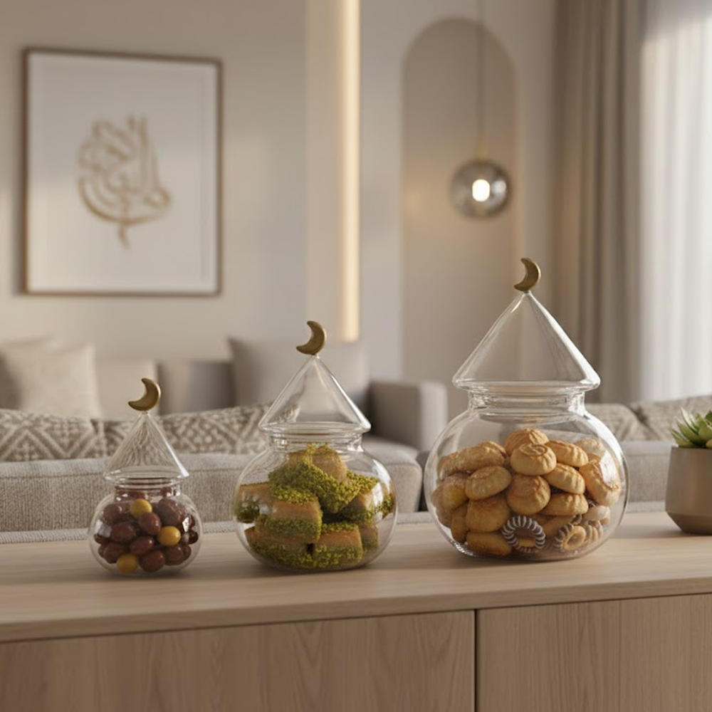 الزجاج الشفاف يبرز المحتوى بشكل جميل، بينما الغطاء المخروطي مع الهلال الذهبي يمنح الطقم طابعًا فخمًا يليق بالمناسبات الخاصة والاستقبال اليومي.