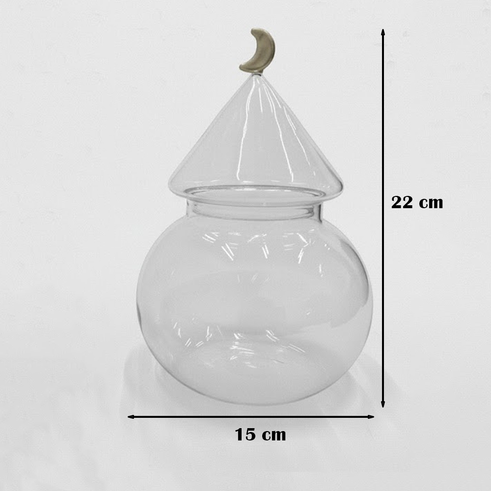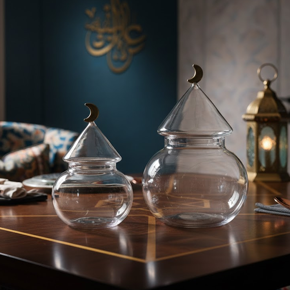 غرشة ضيافة زجاجية بغطاء هلال – تصميم فاخر للتمور والمكسرات
