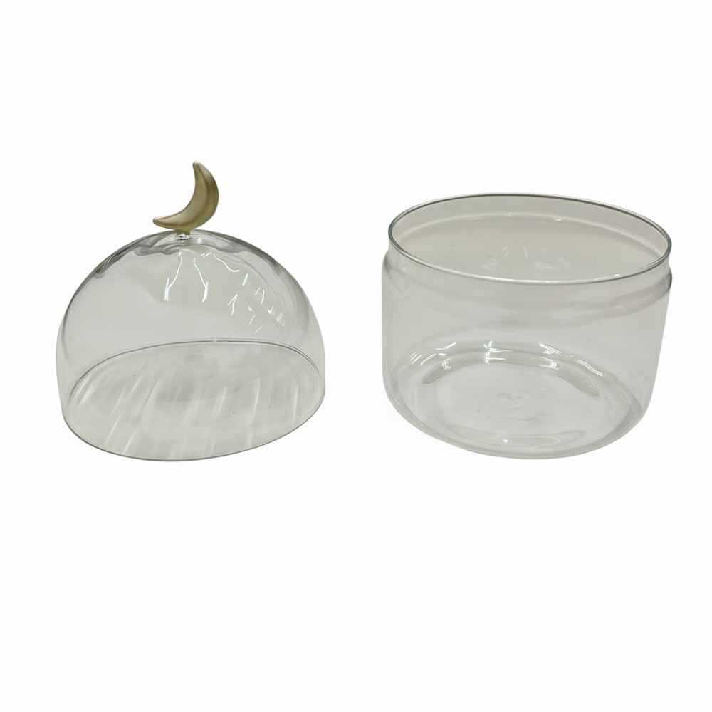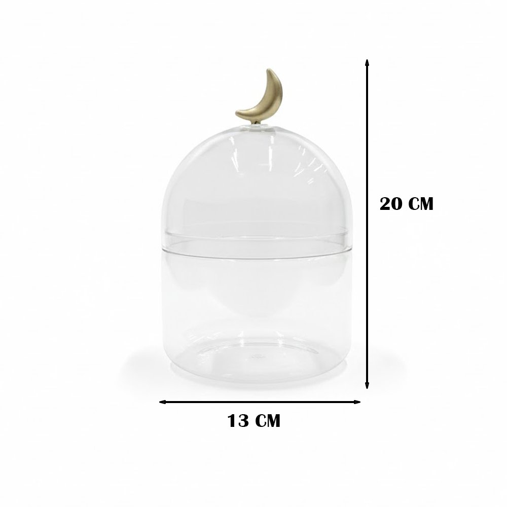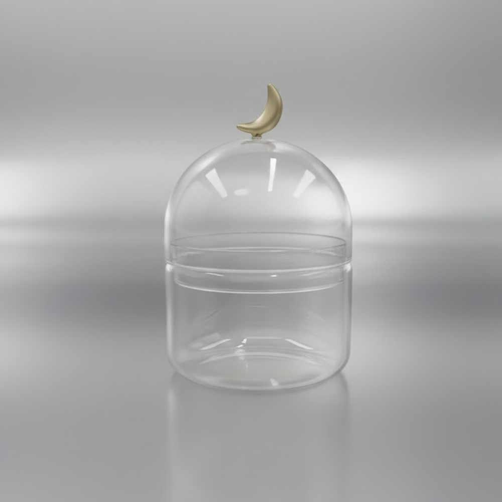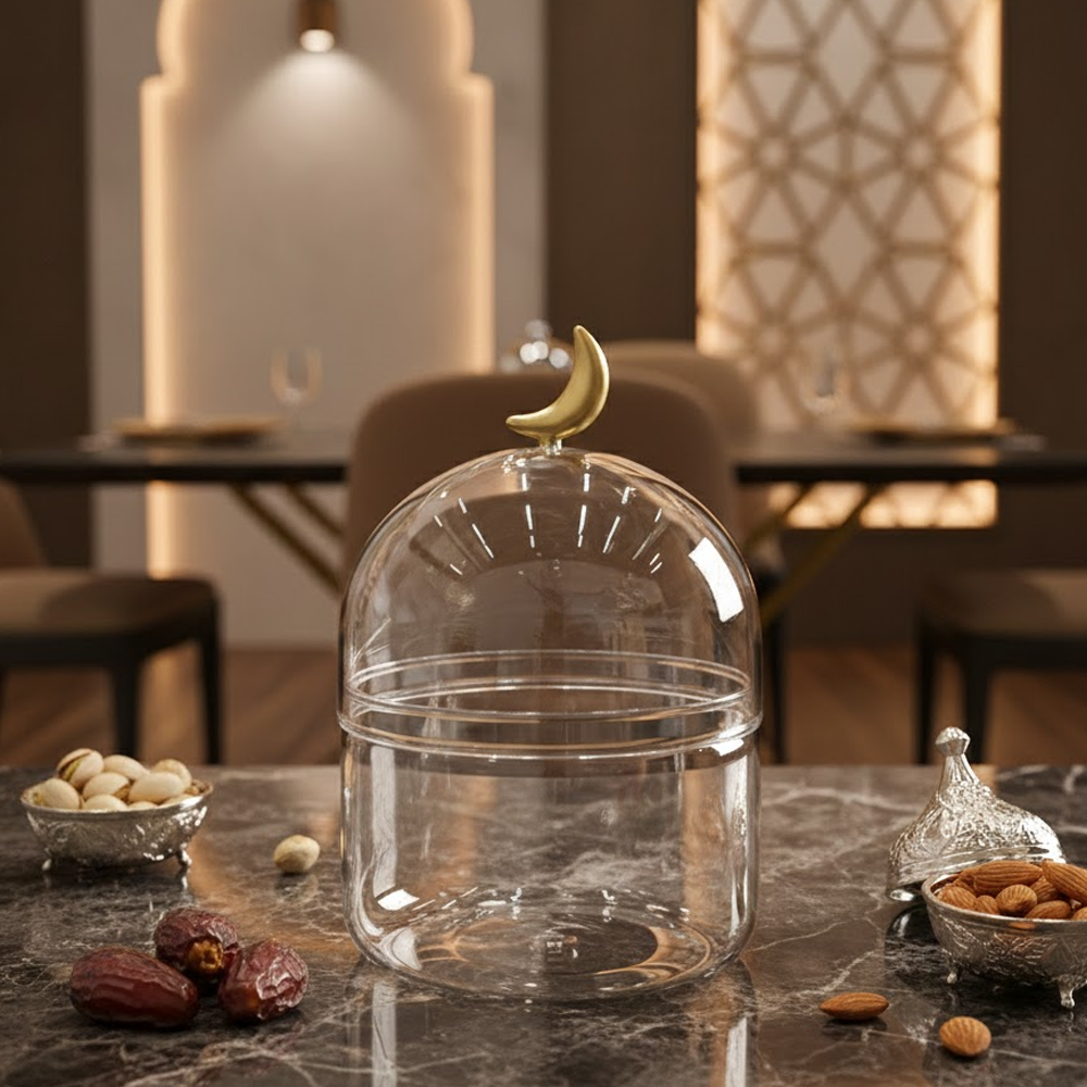 الزجاج الشفاف عالي الجودة يُظهر المحتويات بشكل جميل، بينما يمنح الغطاء المقبب مع الهلال الذهبي إحساسًا بالفخامة والأناقة، ليكون خيارًا مثاليًا لتقديم التمور، الشوكولاتة، المكسرات أو الحلويات.