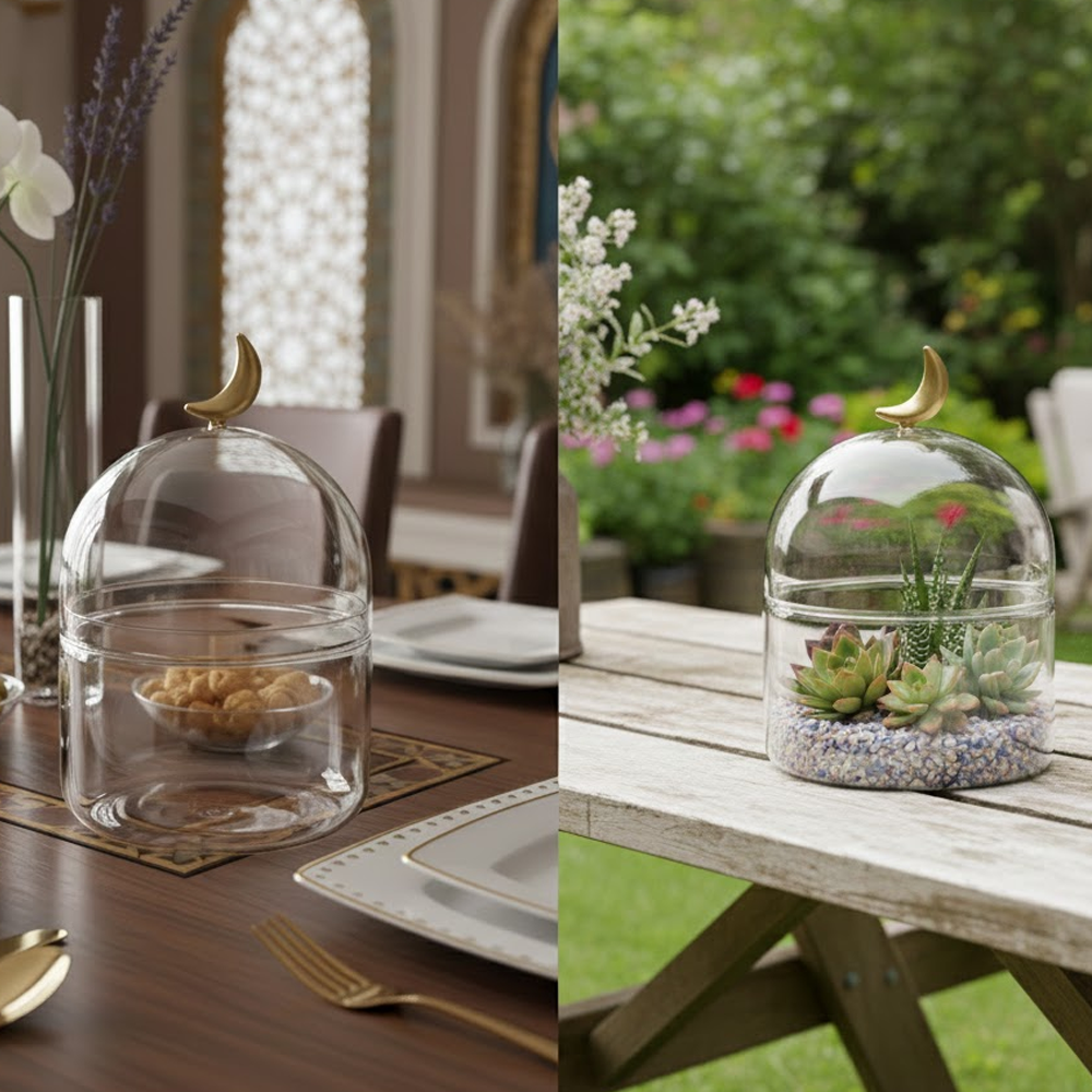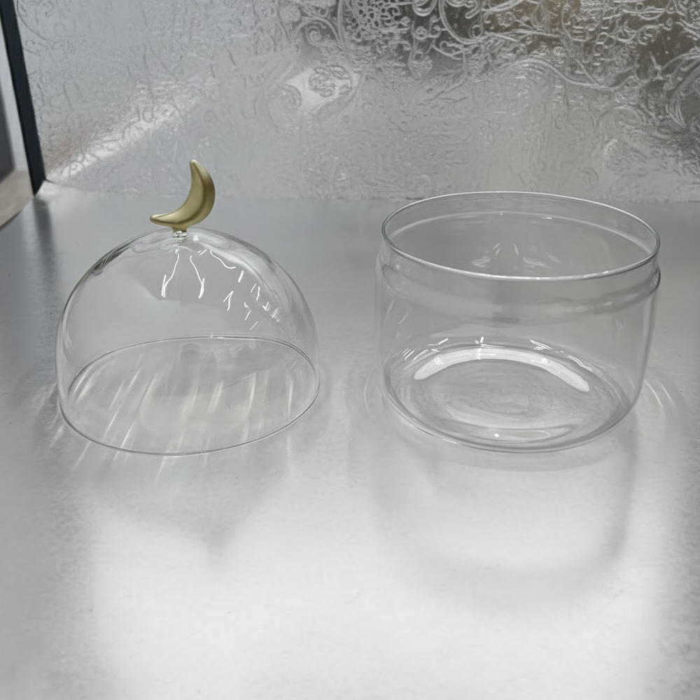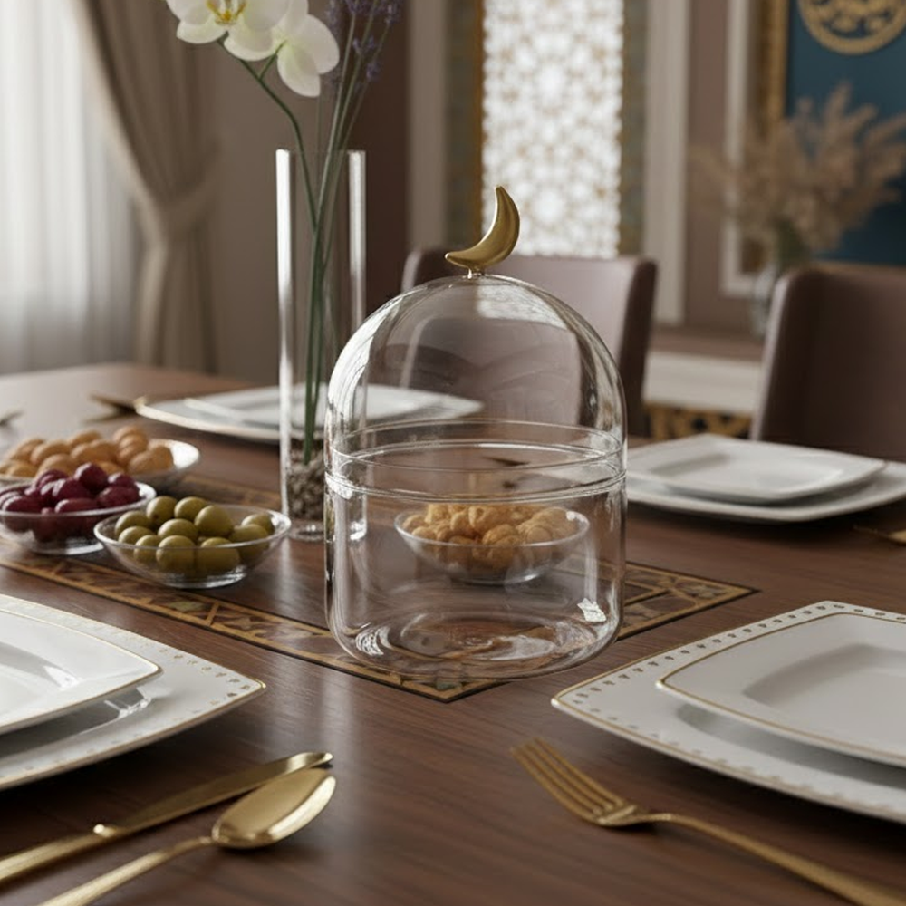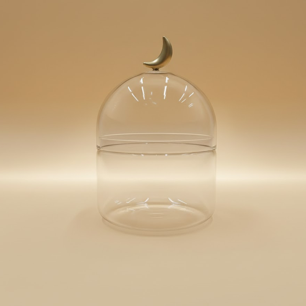 الزجاج الشفاف عالي الجودة يُظهر المحتويات بشكل جميل، بينما يمنح الغطاء المقبب مع الهلال الذهبي إحساسًا بالفخامة والأناقة، ليكون خيارًا مثاليًا لتقديم التمور، الشوكولاتة، المكسرات أو الحلويات.