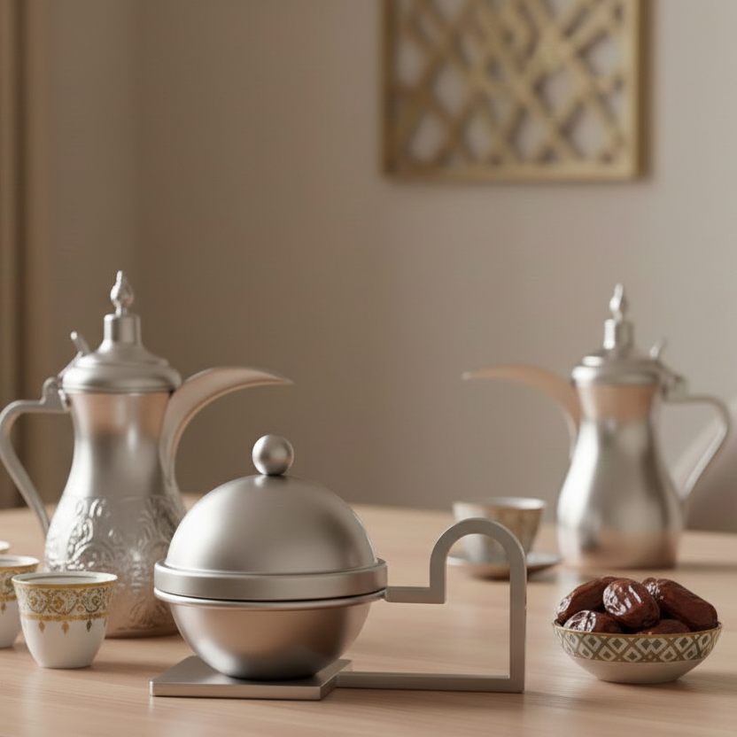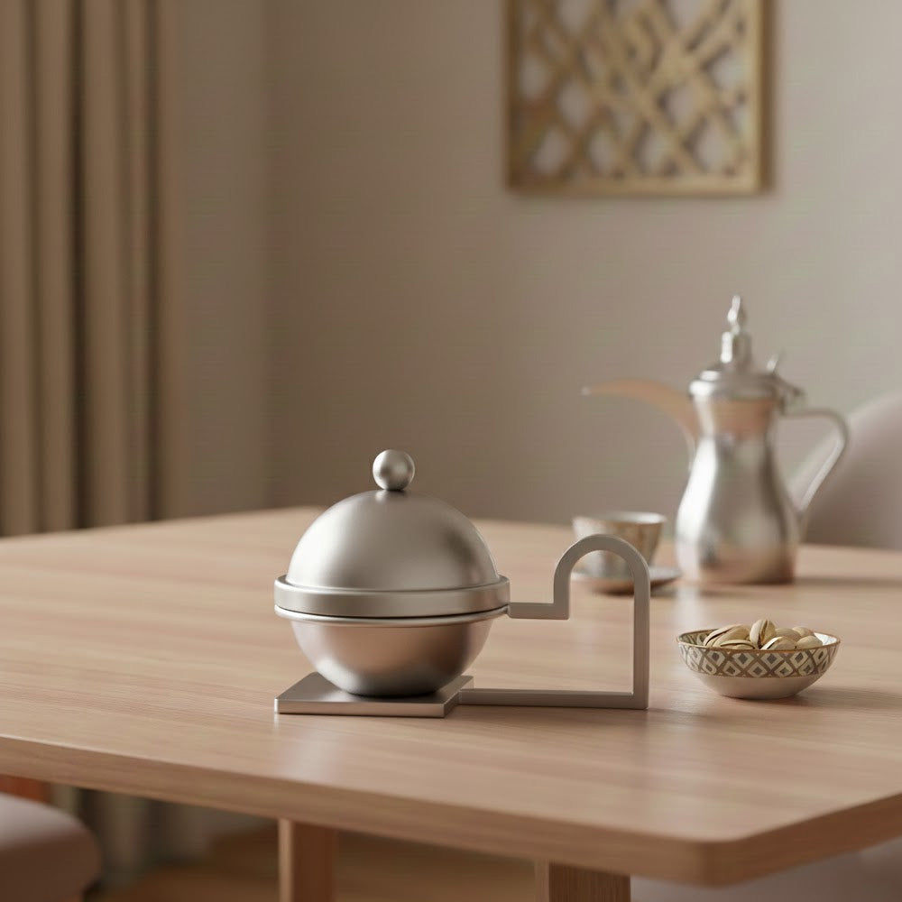 قاعدة ذكية: مزود بحامل متصل بمقبض جانبي هندسي، يسهل عليكِ حمل التمرية وتمريرها للضيوف بكل ثبات وأناقة.