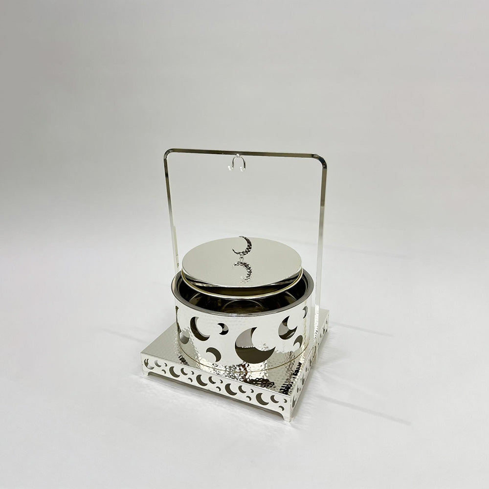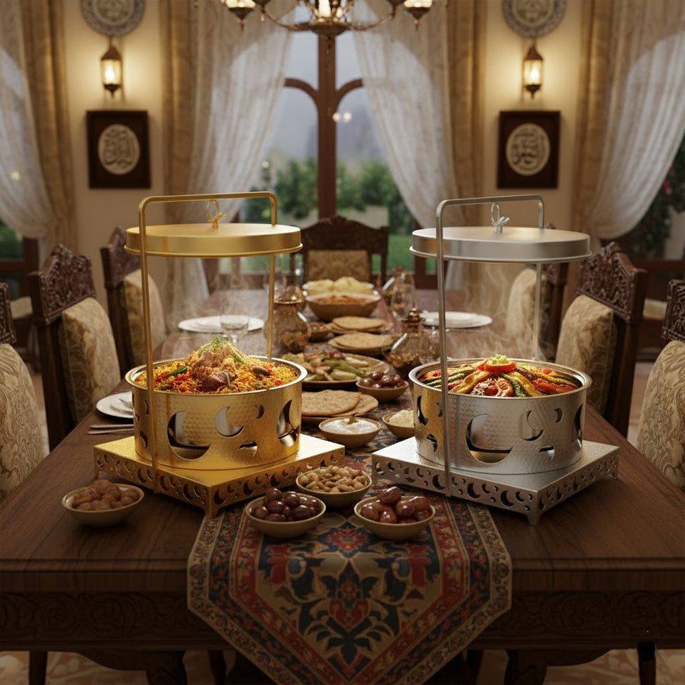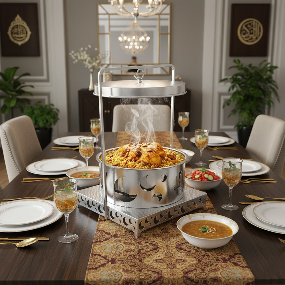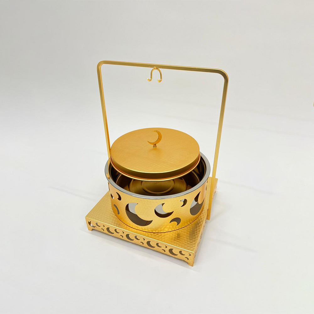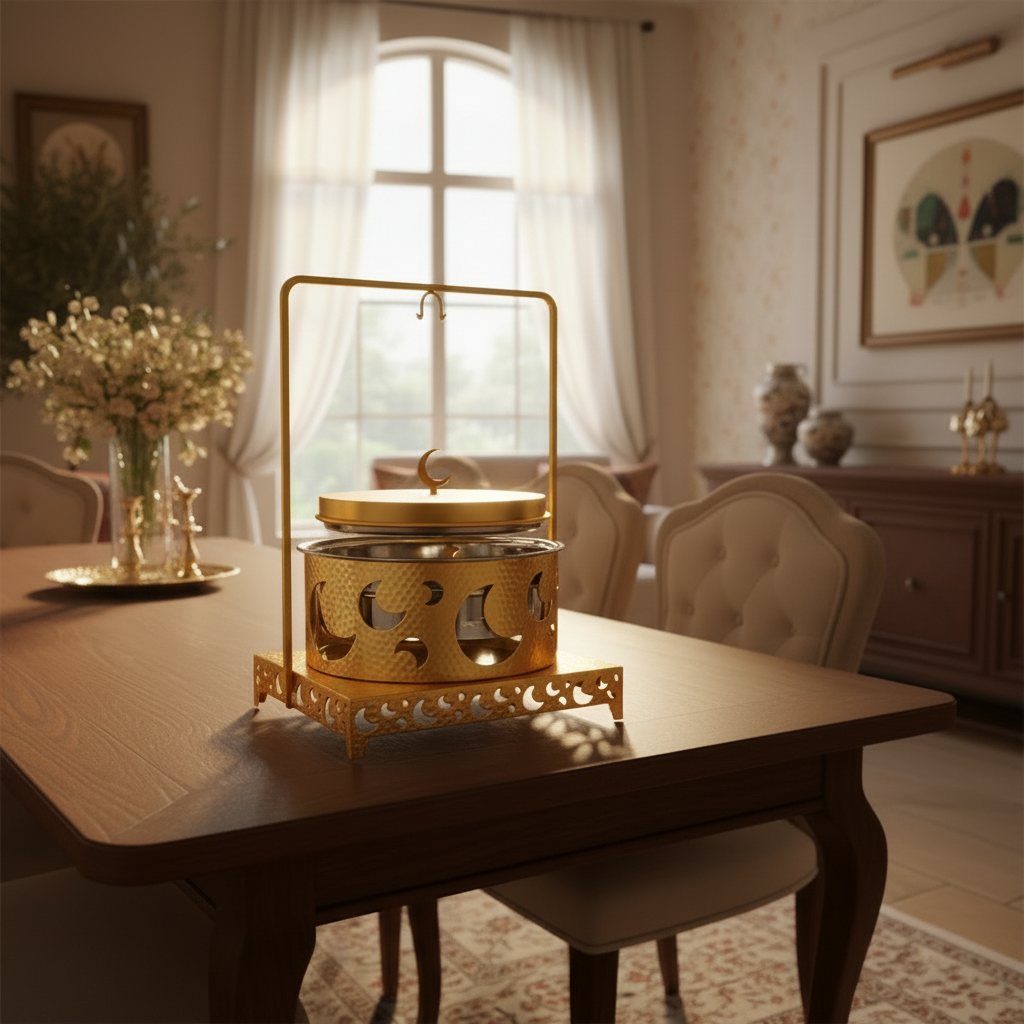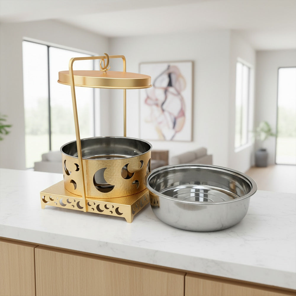 يأتي هذا القدر الساخن المعلق الأنيق، بسعة 6 لترات، بتصميم قمري، مزودًا بوعائين فضيين من الفولاذ المقاوم للصدأ، مثاليًا لتقديم أطباق متعددة أو للحفاظ على دفء الطعام لفترة أطول. يُضفي الحامل الأنيق المقطوع على شكل قمر والغطاء المعلق عليه لمسةً فاخرة، مما يجعله مثاليًا للحفلات والبوفيهات والتجمعات العائلية. متوفر باللونين الذهبي والفضي.
