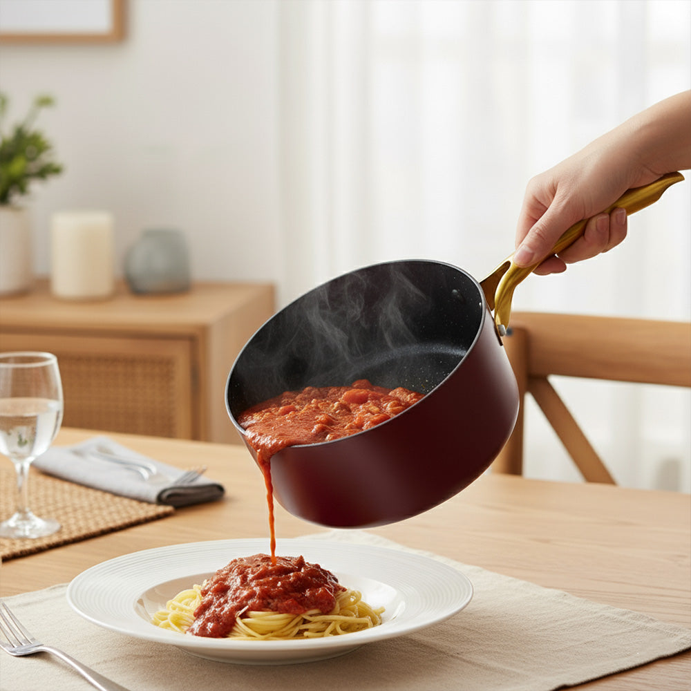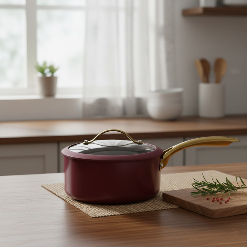 حسّن مطبخك مع قدر داني هوم الأنيق غير اللاصق، الذي يتميز ببطانة داخلية متينة مطلية بالرخام ومقبض ذهبي أنيق. متوفر بحجمين: 1.9 لتر (18 سم) و2.7 لتر (20 سم)، هذا القدر مثالي للطهي اليومي، من الحساء والصلصات إلى المعكرونة والخضراوات. يأتي مع غطاء زجاجي مقاوم للحرارة وقاعدة معززة آمنة للاستخدام في الحث الحراري لتسخين سريع ومتساوي.