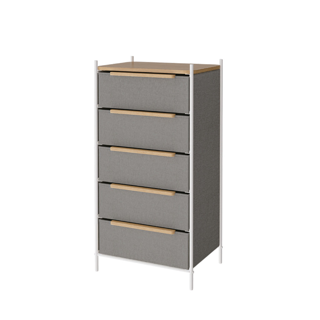 توافق عالمي - أدراج قماشية فاخرة باللون الرمادي الداكن وإطار معدني أبيض قوي وسطح طاولة خشبي مقاوم للماء تمنح منظم التخزين نمطًا عصريًا. تناسب هذه الوحدة بسهولة مساحات المعيشة المختلفة: غرف المعيشة وغرف النوم والممرات والمداخل والخزائن ودور الحضانة وما إلى ذلك.