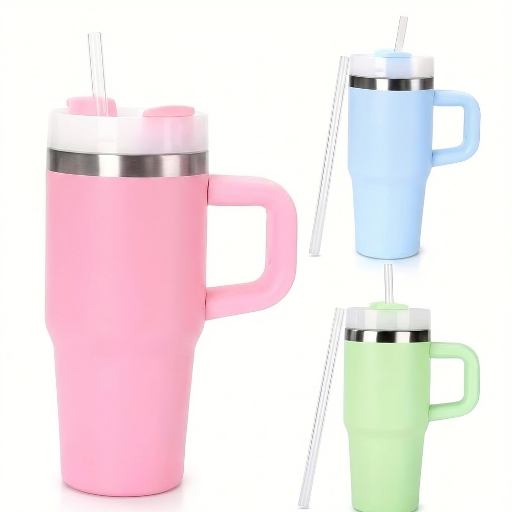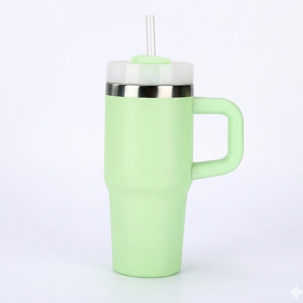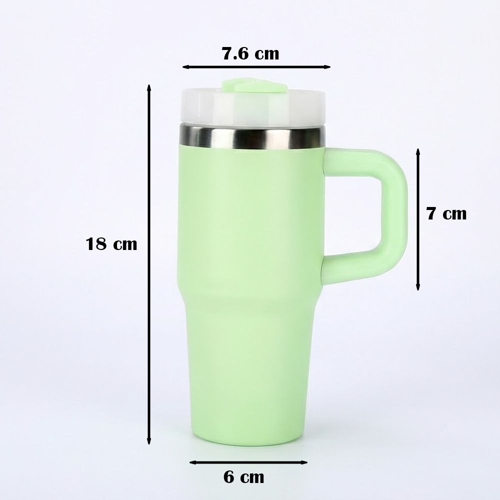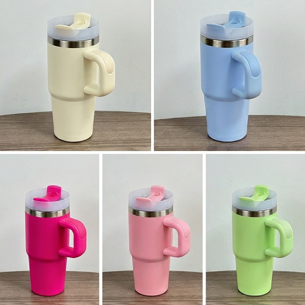 كوب حراري عملي مزود بيد مريحة وغطاء محكم الإغلاق يمنع الانسكاب، مع إمكانية استخدام المصاصة للشرب بسهولة. تصميم أنيق وألوان ناعمة تناسب المدرسة، العمل، السيارة، أو الاستخدام اليومي في المنزل.